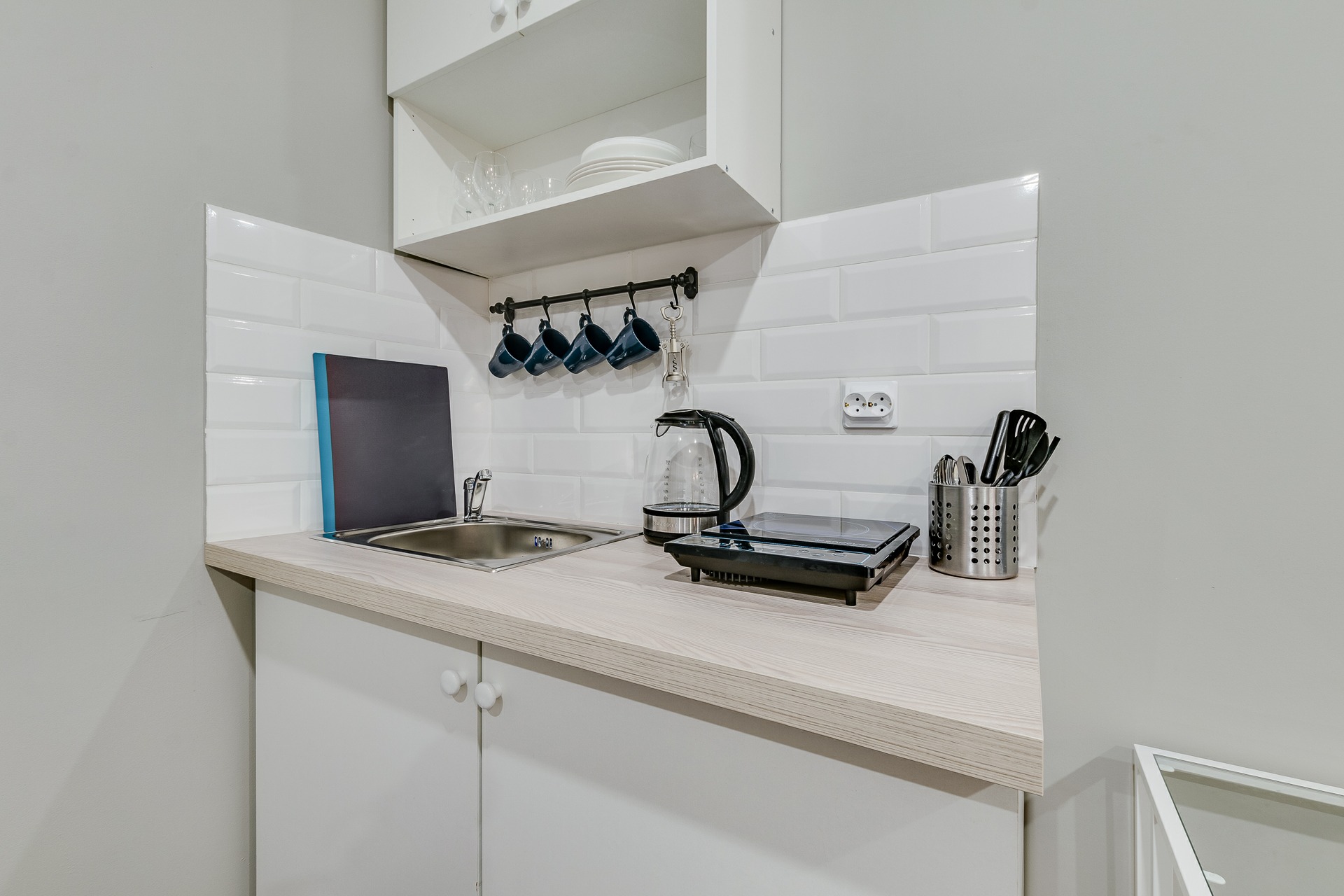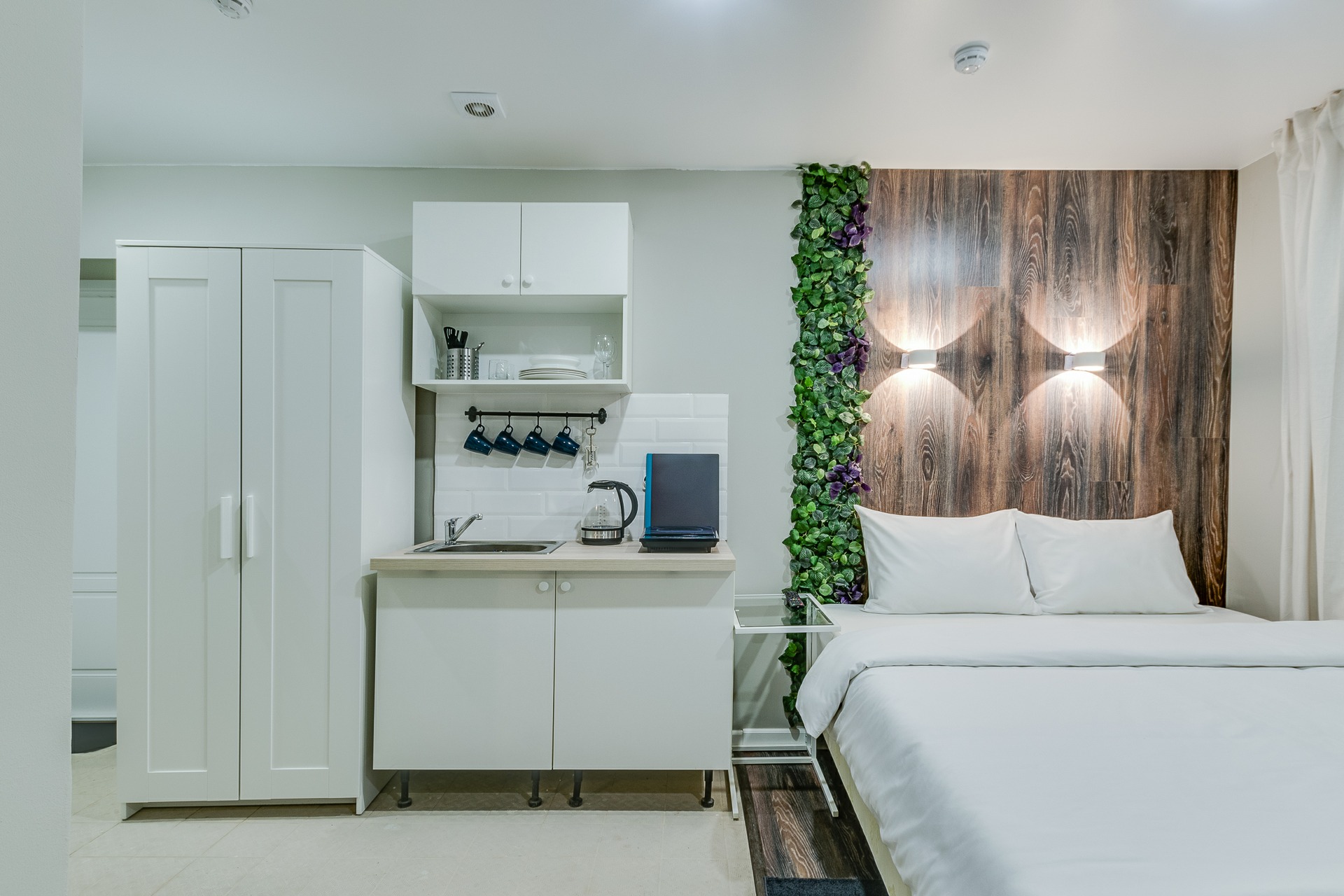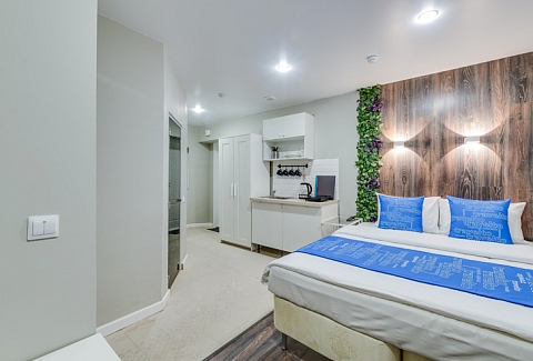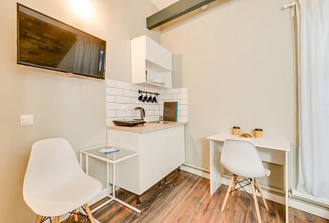 В номере: кровать двуспальная, стол, стулья, тумба, шкаф, шкаф для посуды, мини-холодильник, набор посуды, плита электрическая, телевизор ЖК, электрочайник
