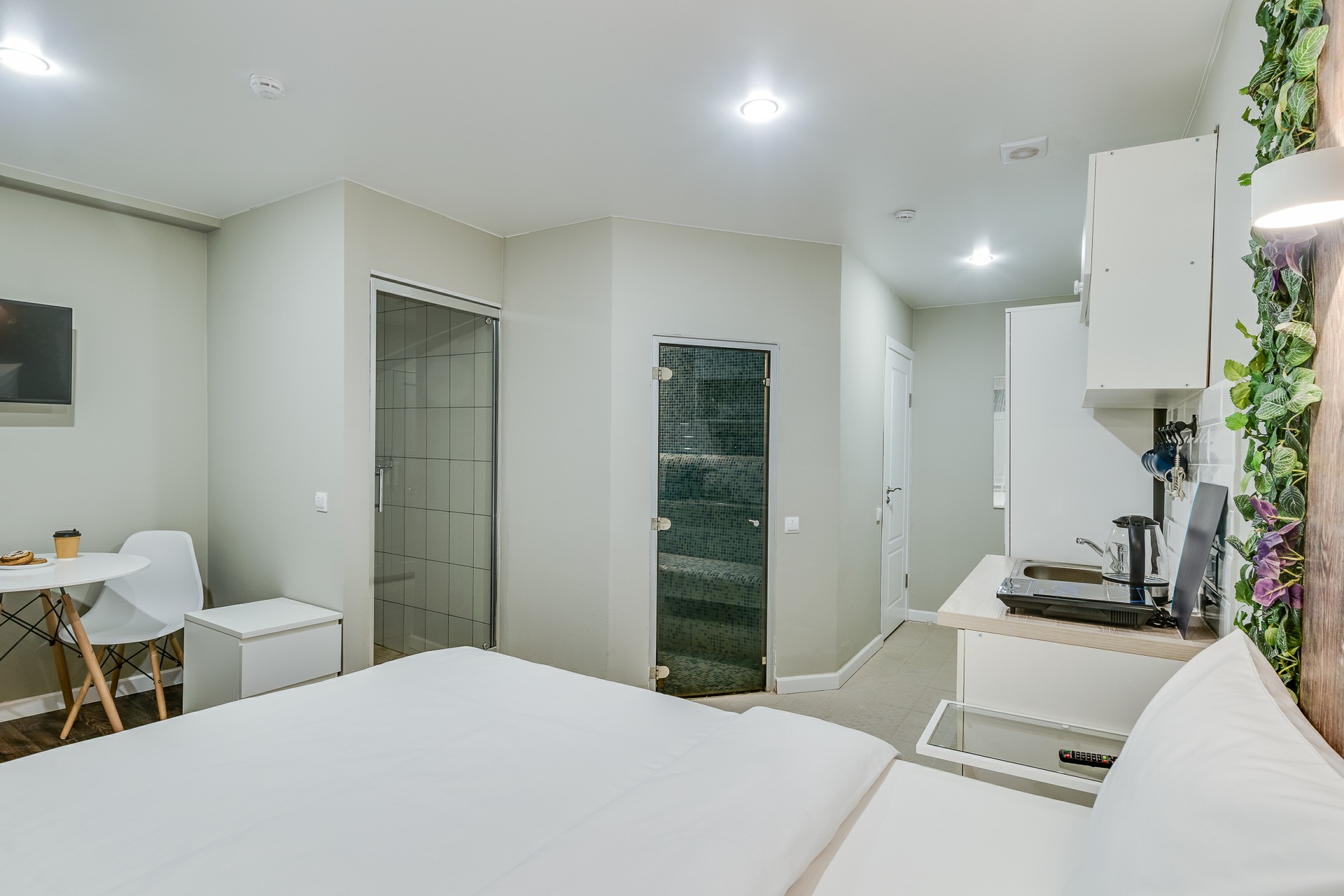 В номере: зеркало, кровать двуспальная, стол, стулья, тумба, шкаф, шкаф для посуды, мини-холодильник, набор посуды, плита электрическая, телевизор ЖК, электрочайник