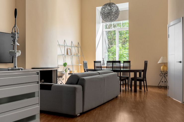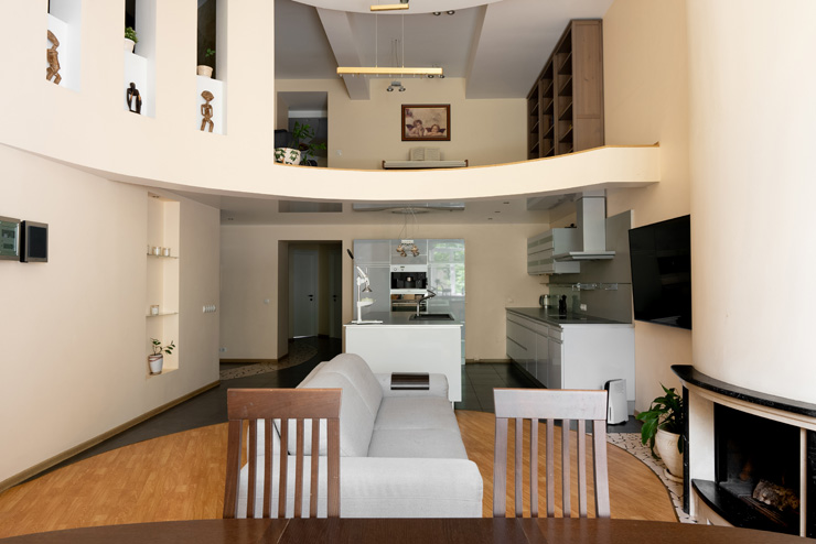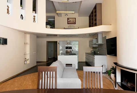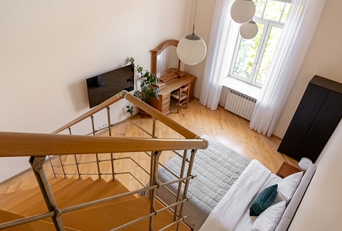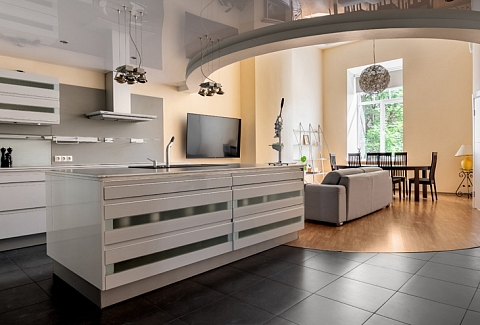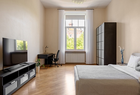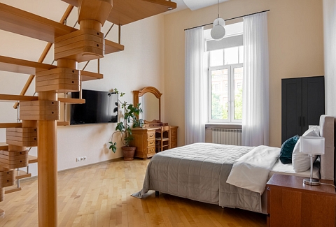 В номере: гардеробная, диван раскладной, зеркало, кровать двуспальная, прикроватные тумбочки, стол, стулья, шкаф, гладильная доска, духовой шкаф, кофемашина, микроволновая печь, набор посуды, плита электрическая, посудомоечная машина, стиральная машина, телевизор, утюг, холодильник, электрочайник