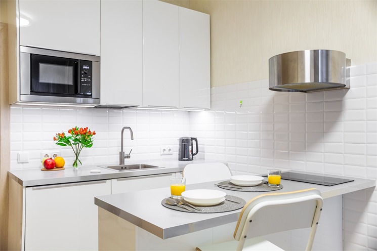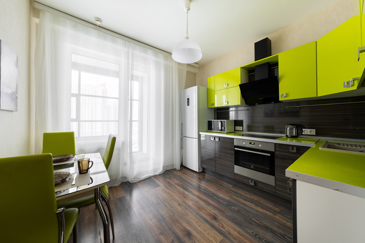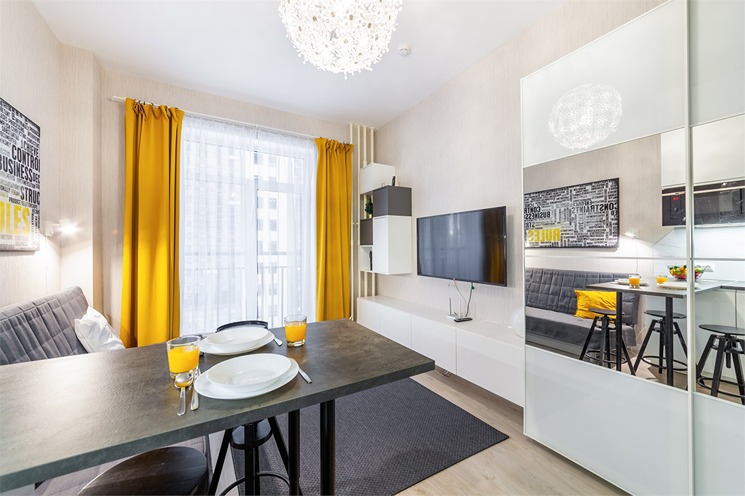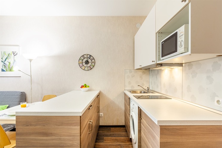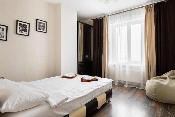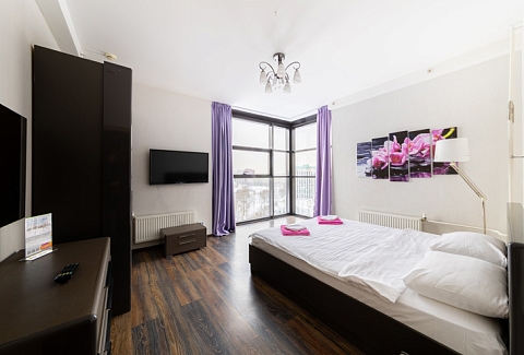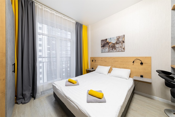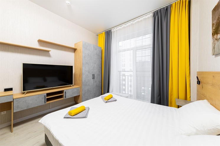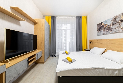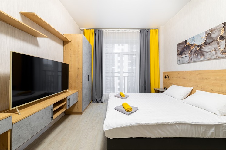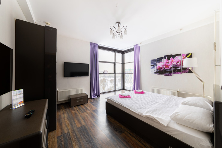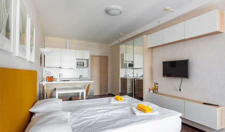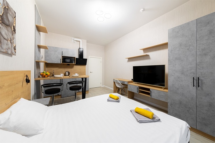 В номере: вешалка, зеркало, кровать двуспальная, стол, стулья, шкаф, гладильная доска, духовой шкаф, микроволновая печь, набор посуды, плита электрическая, стиральная машина, телевизор, утюг, холодильник, электрочайник