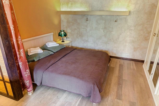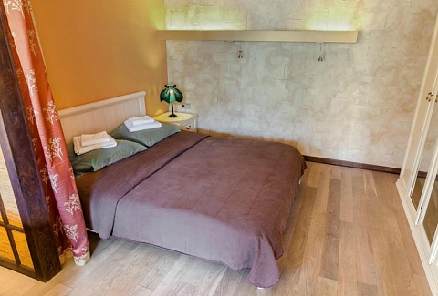 В номере: вешалка, диван раскладной, зеркало, кровать двуспальная, прикроватная тумбочка, стол, стулья, шкаф, гладильная доска, кондиционер, микроволновая печь, набор посуды, плита газовая, стиральная машина, телевизор, телефон, утюг, холодильник, электрочайник