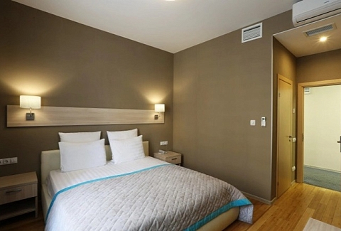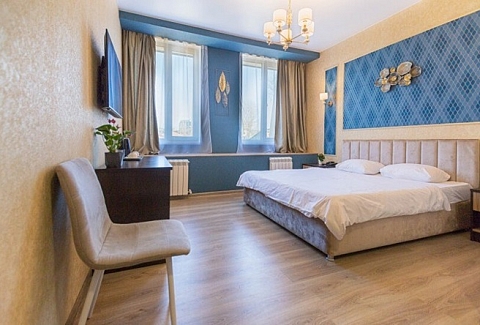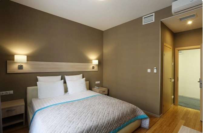 В номере: вешалка, зеркало, кровать двуспальная, стол, стулья, шкаф, кондиционер, мини-холодильник, сейф, телевизор