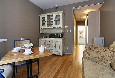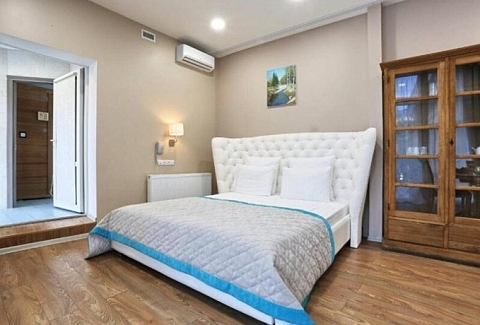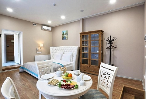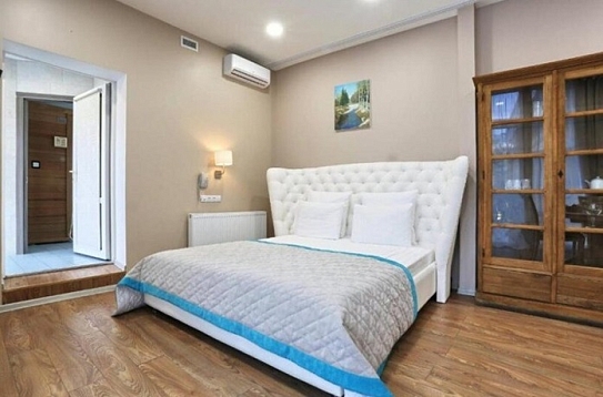 В номере: вешалка, диван, зеркало, кровать двуспальная, прикроватные тумбочки, стол, стулья, шкаф, кондиционер, микроволновая печь, мини-холодильник, набор посуды, плита электрическая, сейф, телевизор, электрочайник