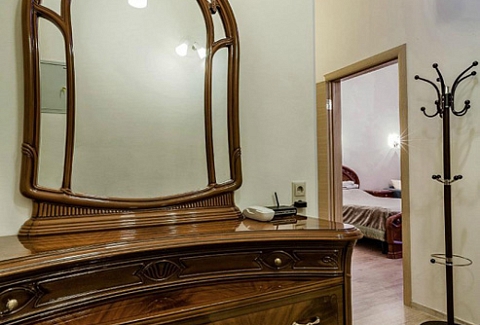 В номере: вешалка, диван раскладной, зеркало, комод, кресло, кровать двуспальная, кухонная мебель, прикроватные тумбочки, стол, стулья, шкаф, гладильная доска, микроволновая печь, набор посуды, плита газовая, стиральная машина, телевизор, телефон, утюг, электрочайник