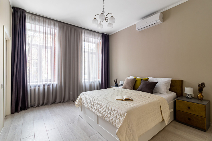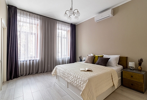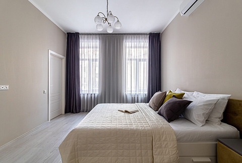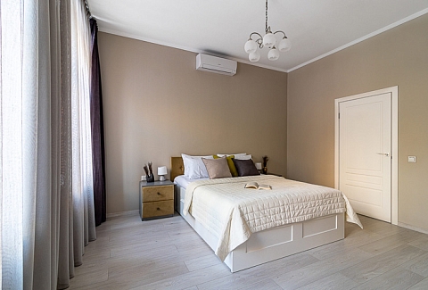 В номере: гардеробная, зеркало, кровать двуспальная, прикроватные тумбочки, стол, стулья, шкаф, гладильная доска, духовой шкаф, кондиционер, кофемашина, микроволновая печь, набор посуды, плита электрическая, посудомоечная машина, стиральная машина, телевизор, утюг, холодильник, электрочайник