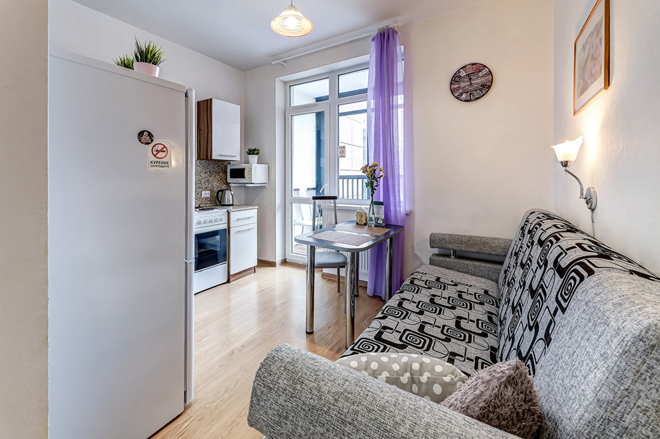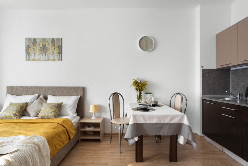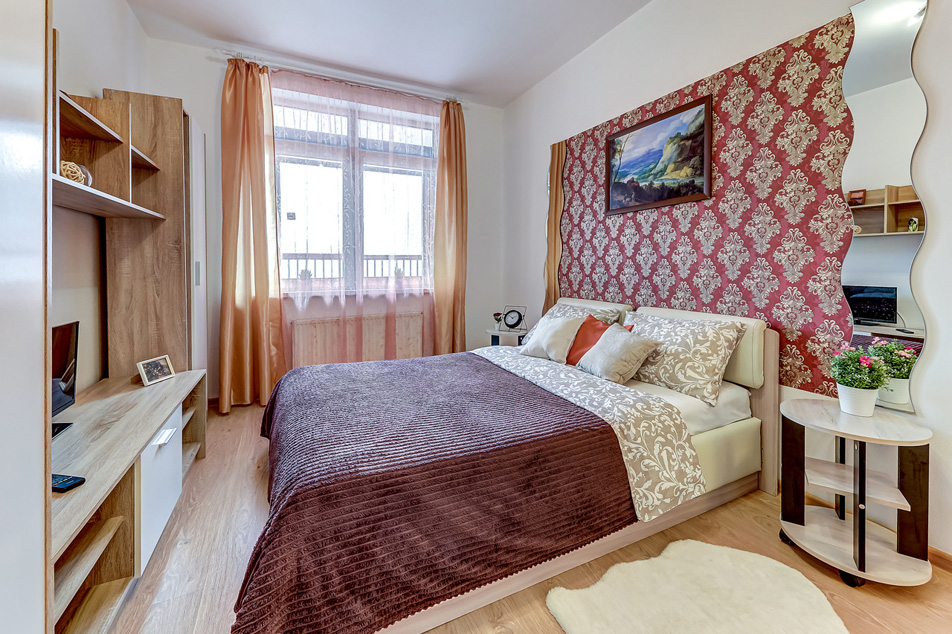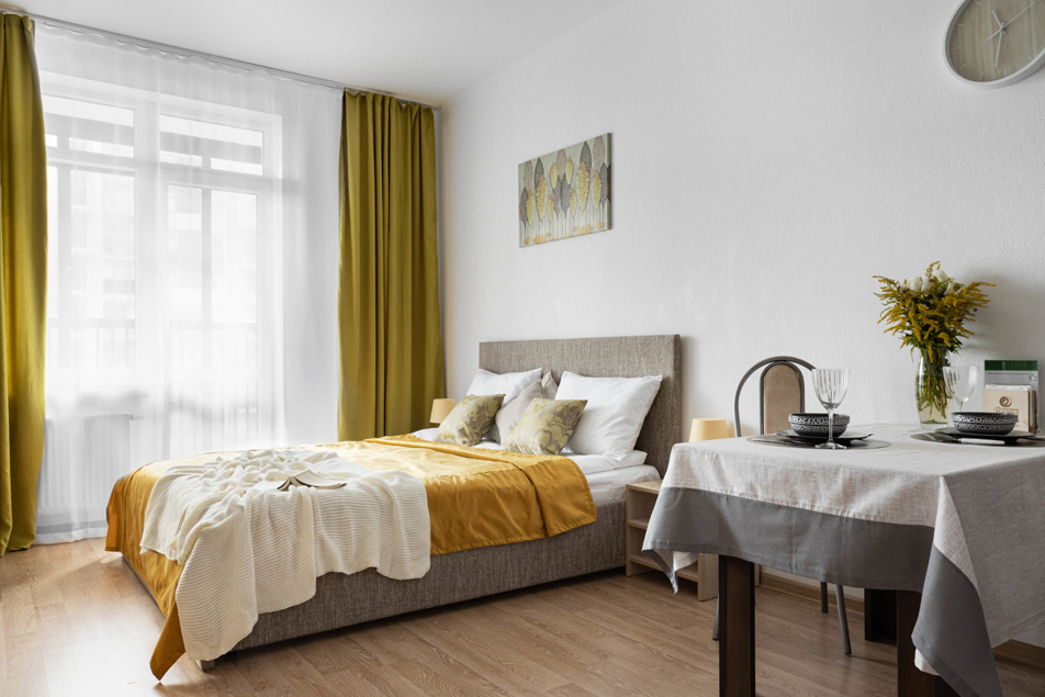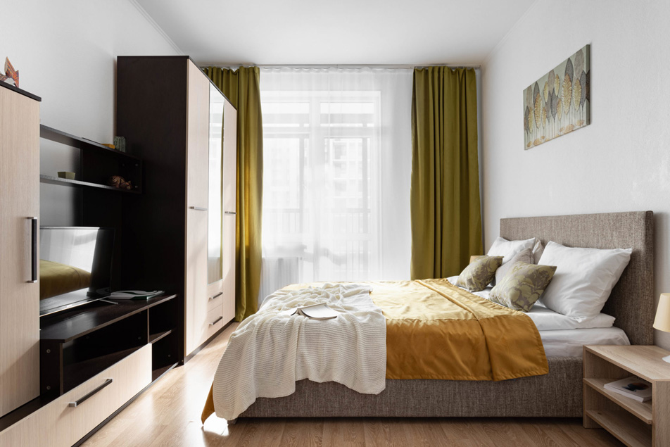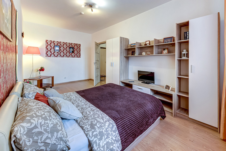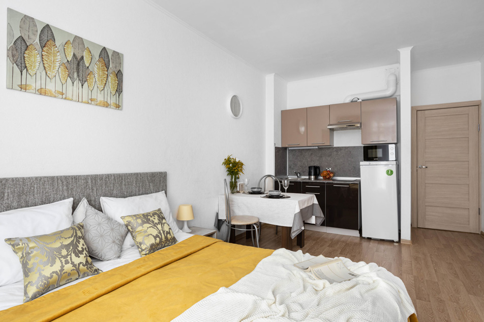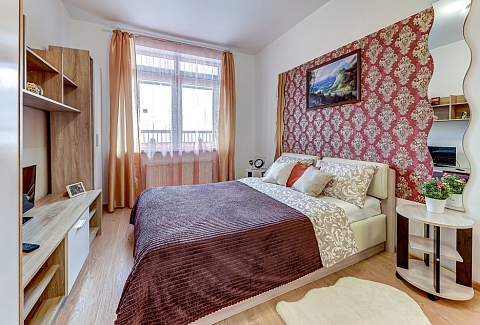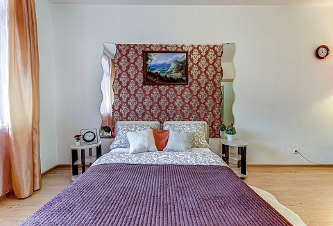В номере: вешалка, диван раскладной, зеркало, кровать двуспальная, прикроватные тумбочки, стол, стулья, шкаф, духовой шкаф, микроволновая печь, набор посуды, плита электрическая, стиральная машина, телевизор, холодильник, электрочайник