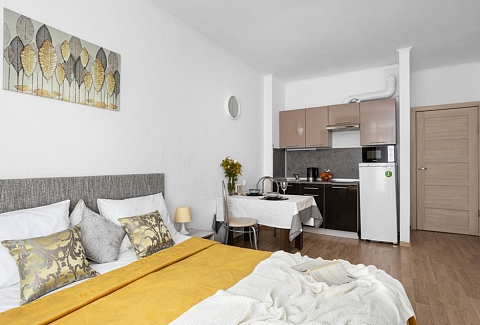 В номере: вешалка, зеркало, кровать двуспальная, прикроватные тумбочки, стол, стулья, шкаф, микроволновая печь, набор посуды, плита электрическая, стиральная машина, телевизор, холодильник, электрочайник