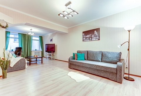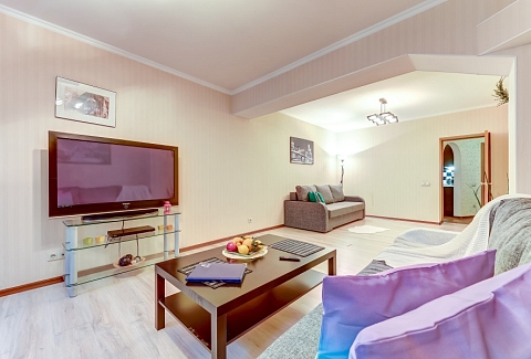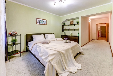 В номере: вешалка, диван раскладной, зеркало, кресло, кровать двуспальная, стол, стулья, шкаф, гладильная доска, микроволновая печь, набор посуды, плита газовая, посудомоечная машина, стиральная машина, телевизор, утюг, холодильник, электрочайник