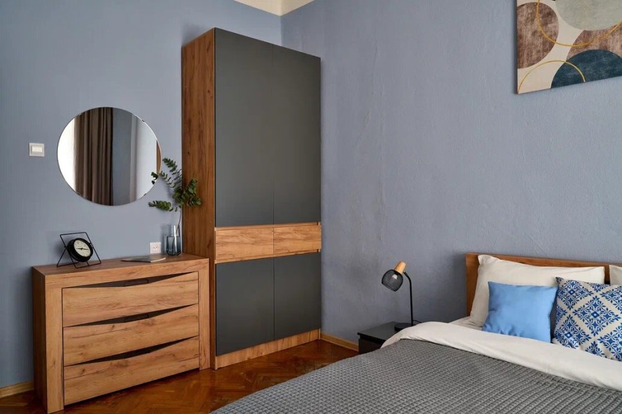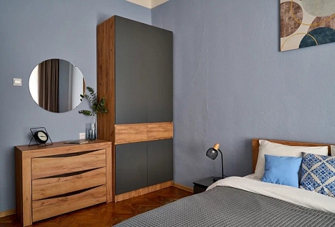 В номере: диван раскладной, кровать двуспальная, прикроватные тумбочки, стол, стулья, шкаф, гладильная доска, микроволновая печь, набор посуды, плита газовая, стиральная машина, телевизор, утюг, холодильник, электрочайник
