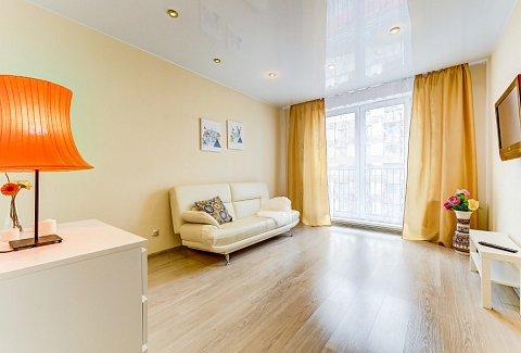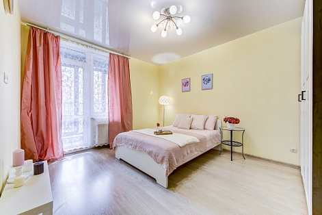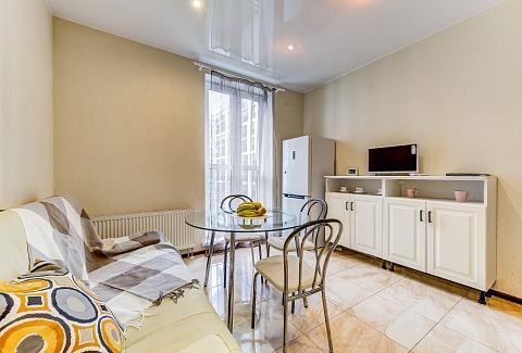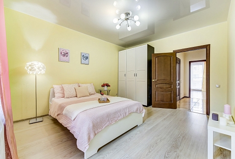 В номере: вешалка, диван раскладной, зеркало, комод, кровать двуспальная, прикроватные тумбочки, стол, стулья, шкаф, духовой шкаф, микроволновая печь, набор посуды, плита электрическая, стиральная машина, телевизор, холодильник, электрочайник