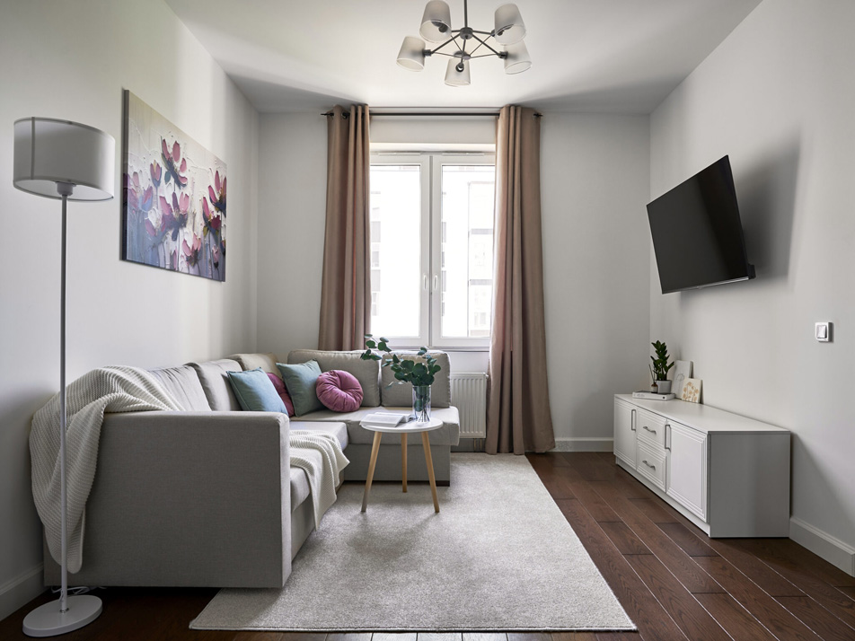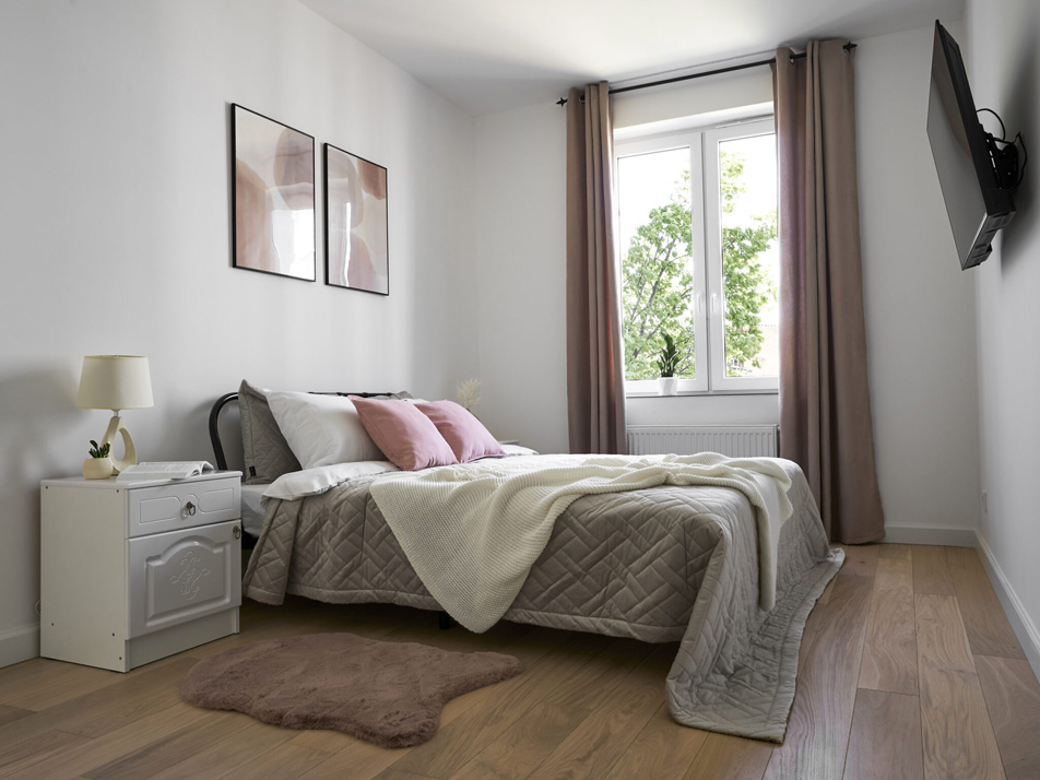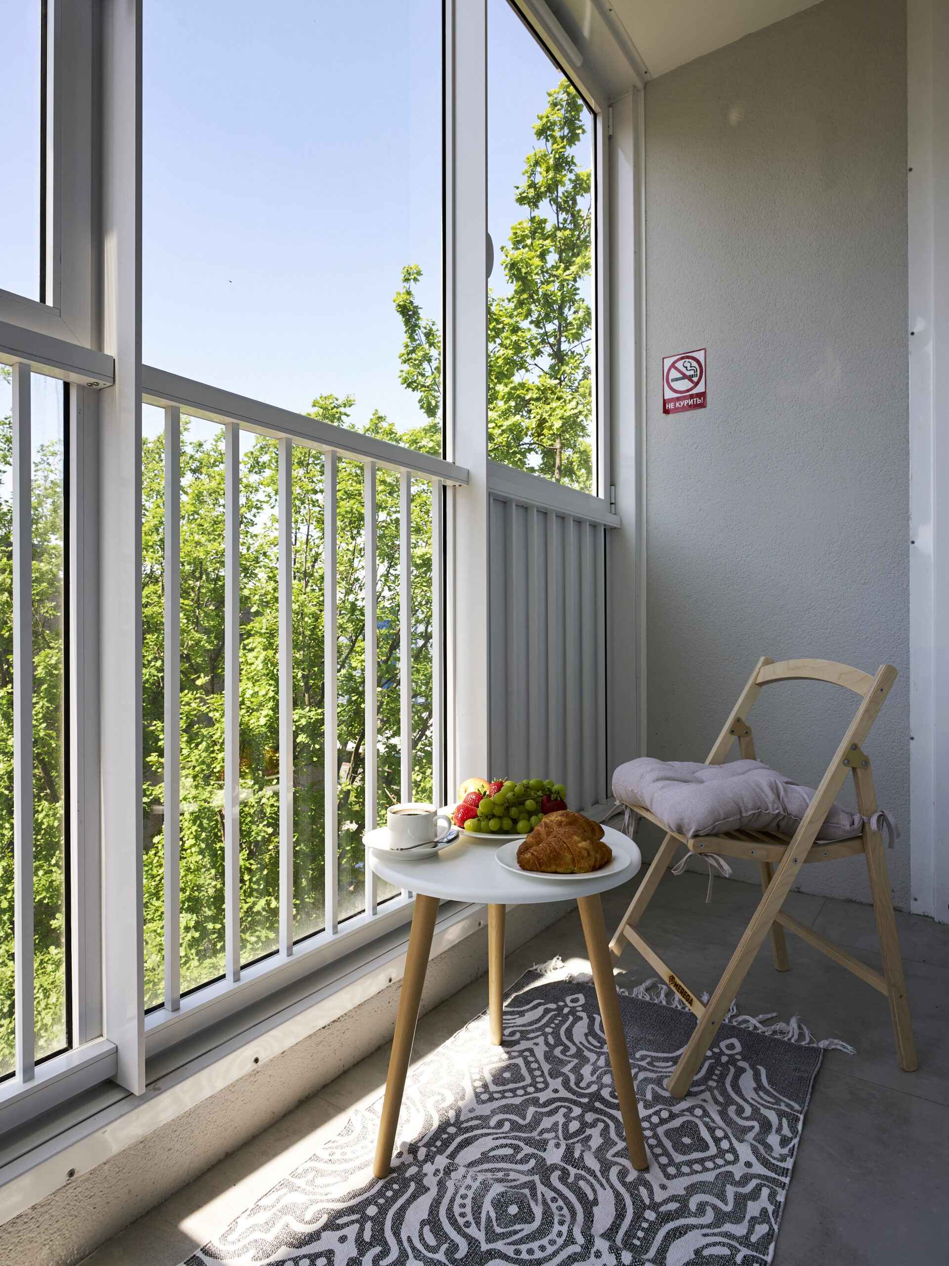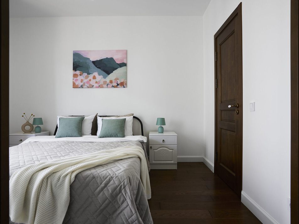 В номере: вешалка, диван раскладной, зеркало, кровать двуспальная, прикроватные тумбочки, стол, стулья, шкаф, кофемашина, микроволновая печь, набор посуды, плита электрическая, посудомоечная машина, стиральная машина, телевизор, холодильник, электрочайник
