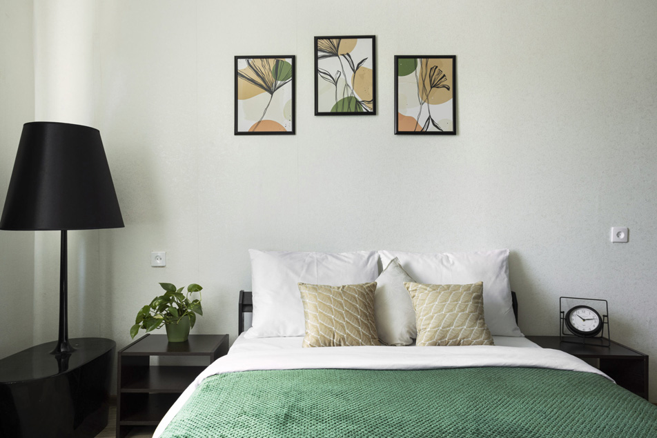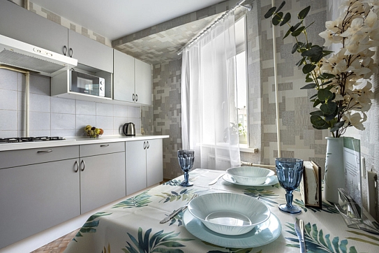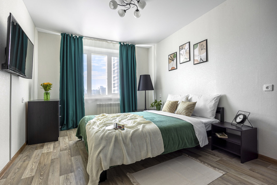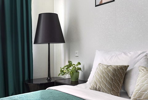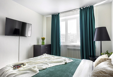 В номере: вешалка, зеркало, комод, кровать двуспальная, прикроватные тумбочки, стол, стулья, шкаф, микроволновая печь, набор посуды, плита газовая, стиральная машина, телевизор, холодильник, электрочайник