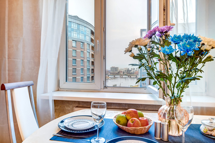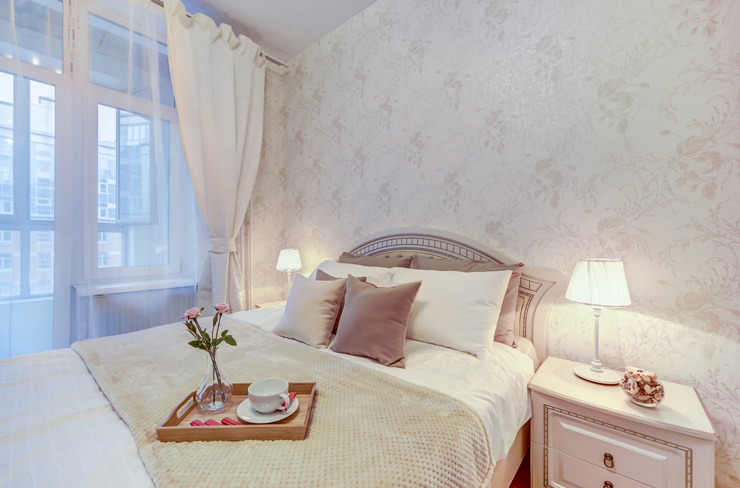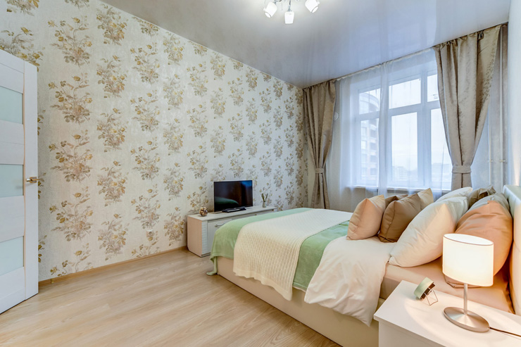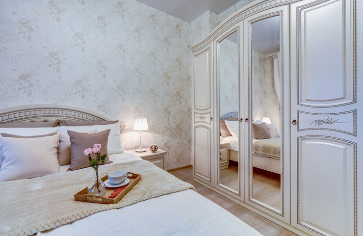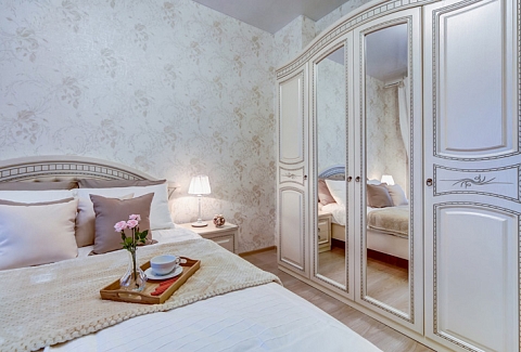 В номере: вешалка, диван, зеркало, кровать двуспальная, прикроватные тумбочки, стол, стулья, шкаф, гладильная доска, духовой шкаф, микроволновая печь, набор посуды, плита электрическая, посудомоечная машина, стиральная машина, телевизор, утюг, холодильник, электрочайник