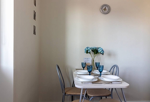 В номере: вешалка, диван раскладной, зеркало, кровать двуспальная, прикроватные тумбочки, стол, стулья, шкаф, духовой шкаф, микроволновая печь, набор посуды, плита электрическая, посудомоечная машина, телевизор, холодильник, электрочайник
