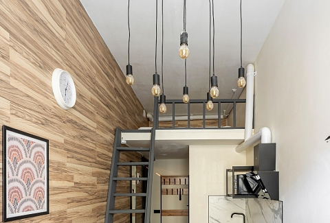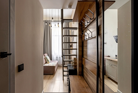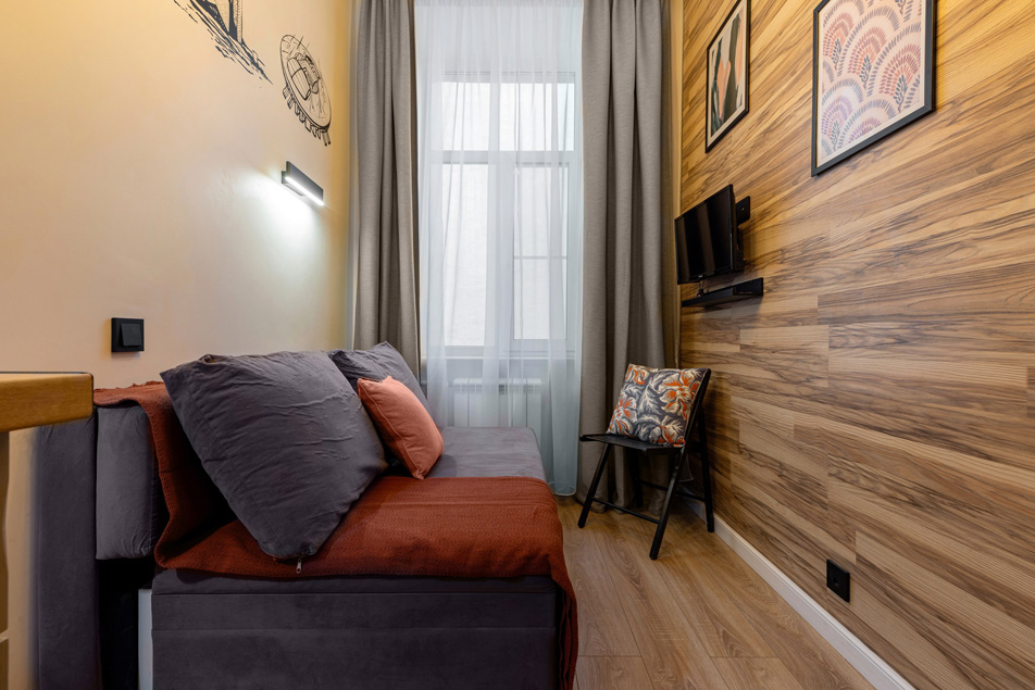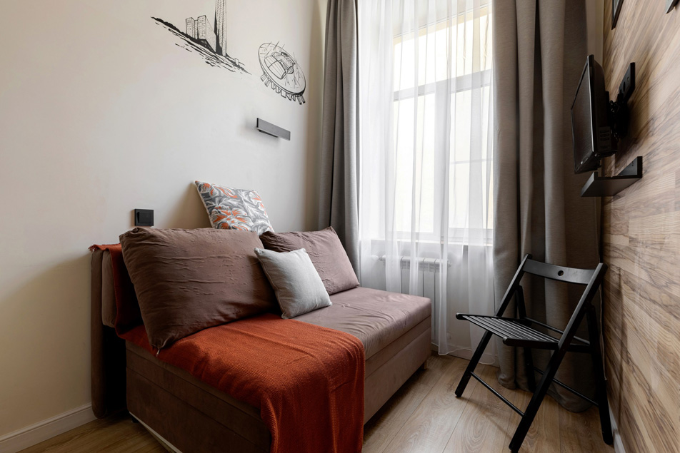 В номере: вешалка, диван раскладной, зеркало, комод, матрас, стол, стулья, микроволновая печь, мини-холодильник, набор посуды, плита электрическая, телевизор, электрочайник