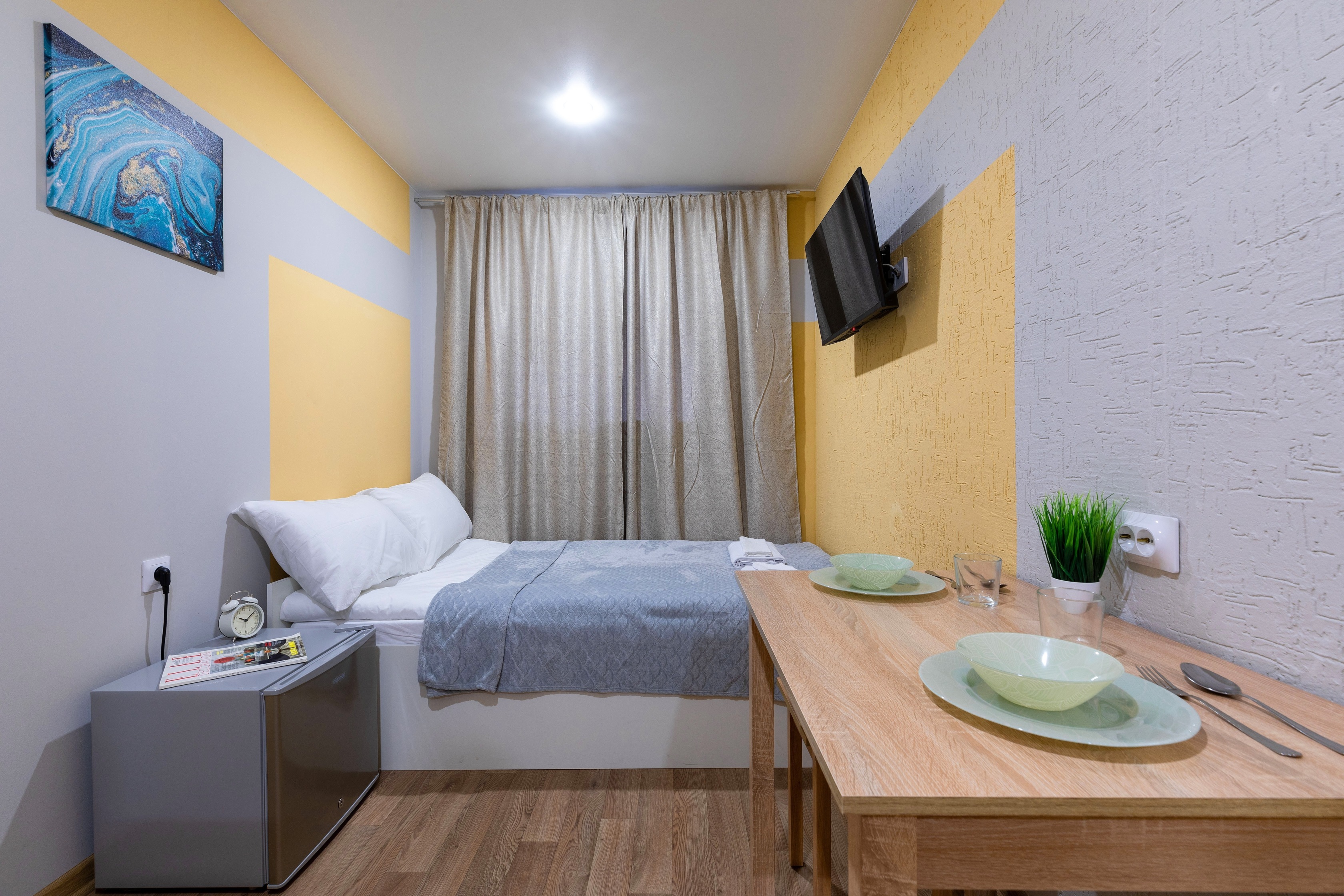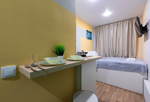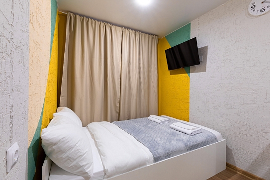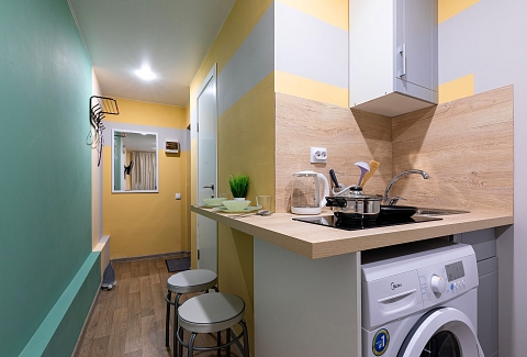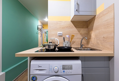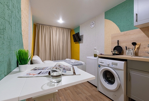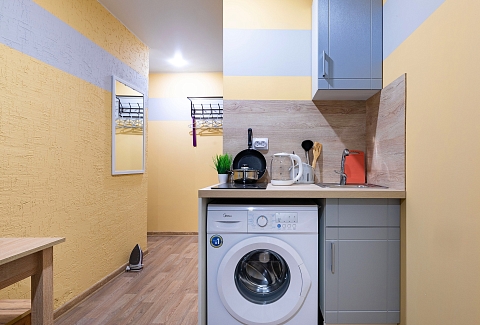 В номере: вешалка, кровать двуспальная, стол, стул, мини-холодильник, плита индукционная, стиральная машина, телевизор ЖК, утюг, чайный набор посуды, электрочайник