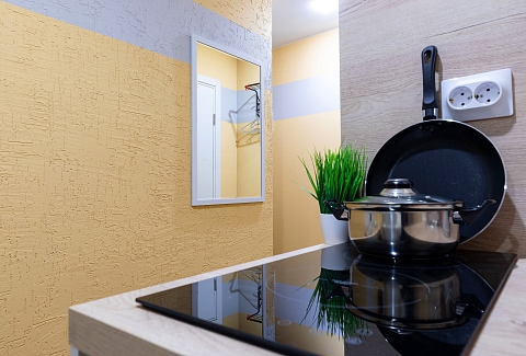 В номере: вешалка, зеркало, кровать двуспальная, стол, стулья, мини-холодильник, набор посуды, плита индукционная, телевизор ЖК, утюг, чайный набор посуды, электрочайник