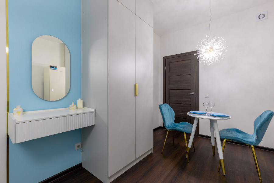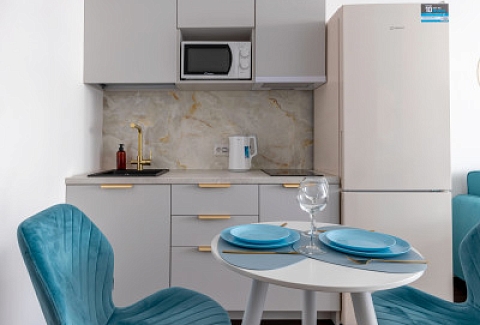 В номере: вешалка, диван, зеркало, кровать двуспальная, прикроватные тумбочки, стол, стулья, шкаф, гладильная доска, микроволновая печь, набор посуды, плита электрическая, стиральная машина, телевизор, утюг, холодильник, электрочайник