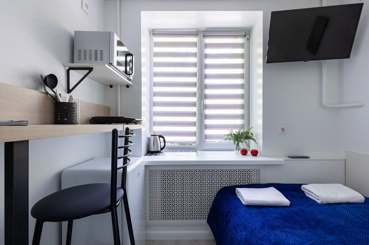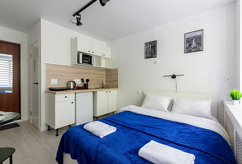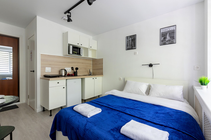 В номере: вешалка, зеркало, кровать двуспальная, стол, стулья, шкаф, микроволновая печь, мини-холодильник, набор посуды, плита электрическая, стиральная машина, телевизор, утюг, электрочайник