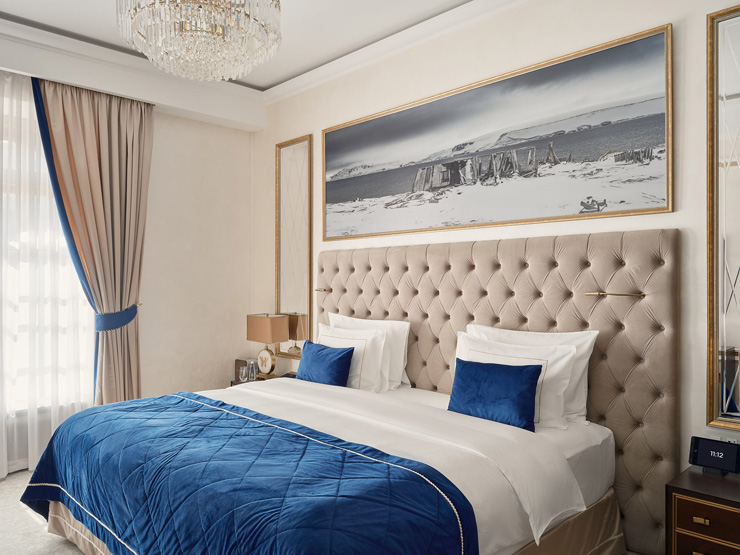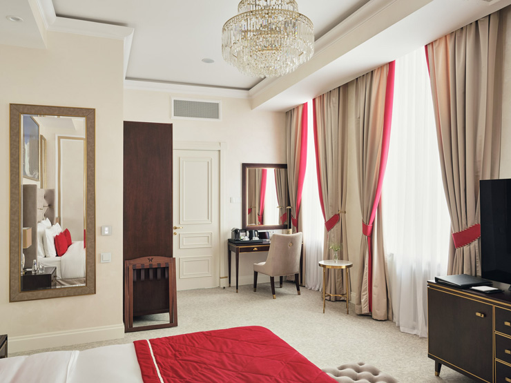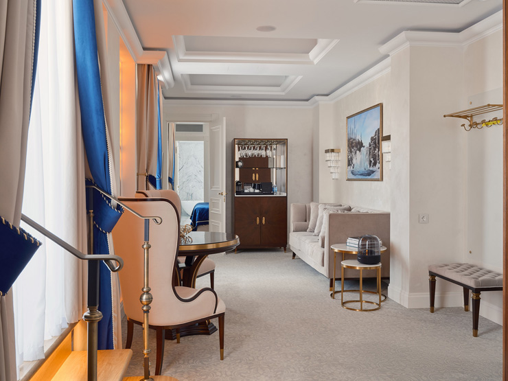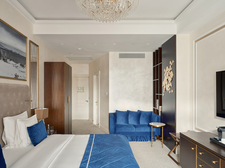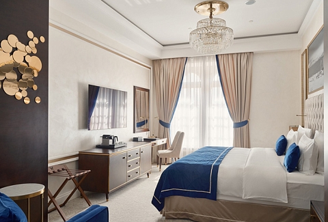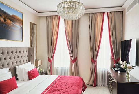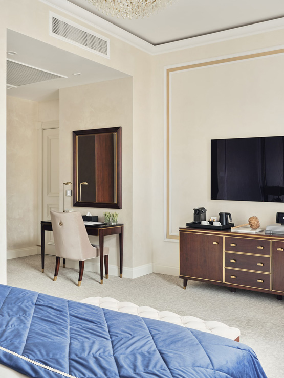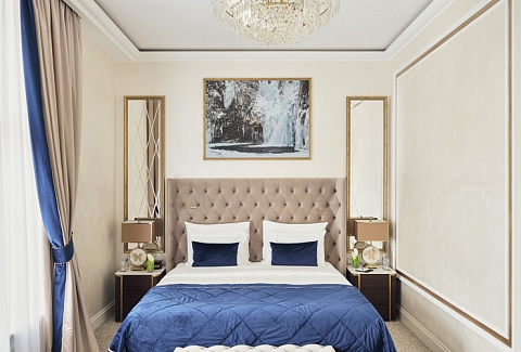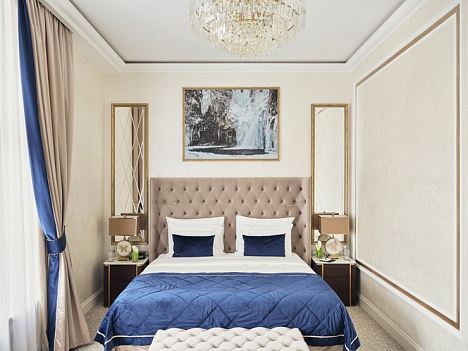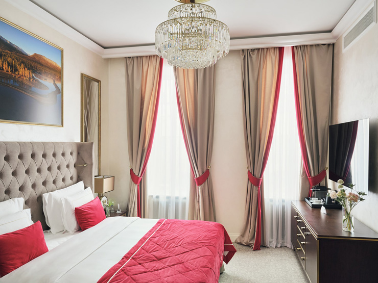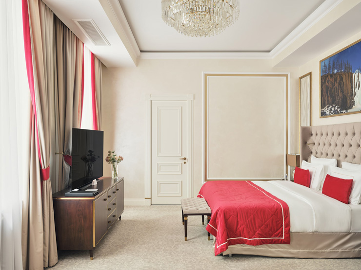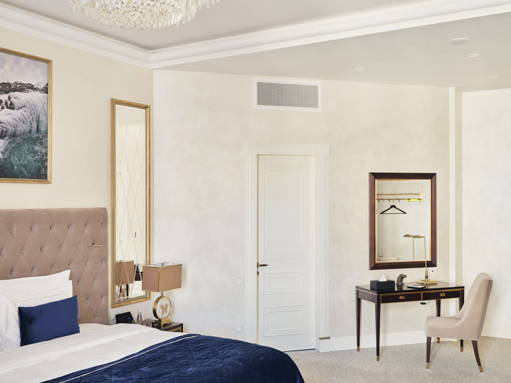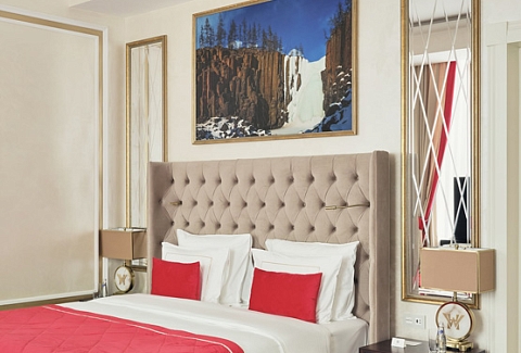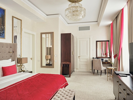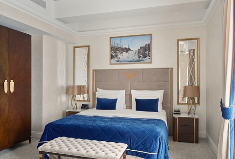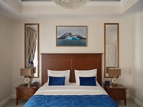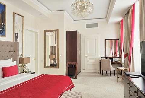 В номере: вешалка, диван, зеркало, кровать двуспальная, прикроватные тумбочки, стол, стулья, шкаф, кофемашина, мини-холодильник, сейф, сплит-система, телевизор, телефон, чайный набор посуды