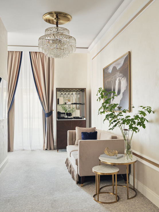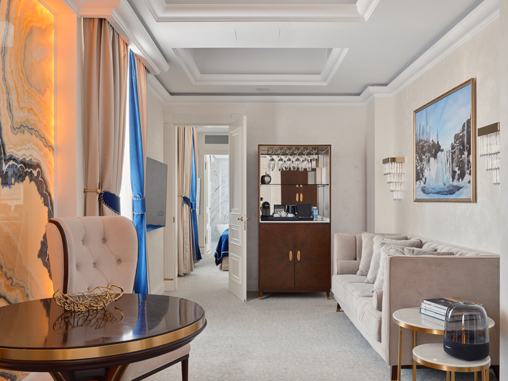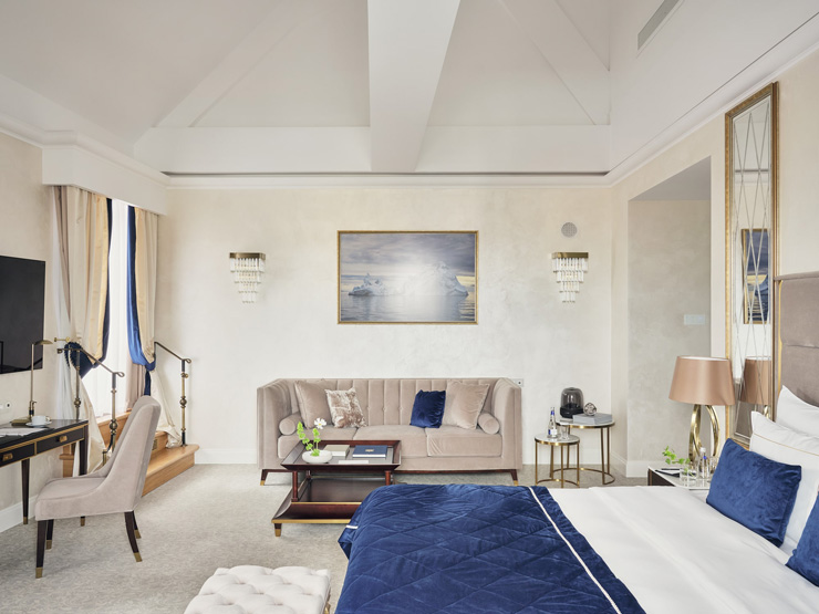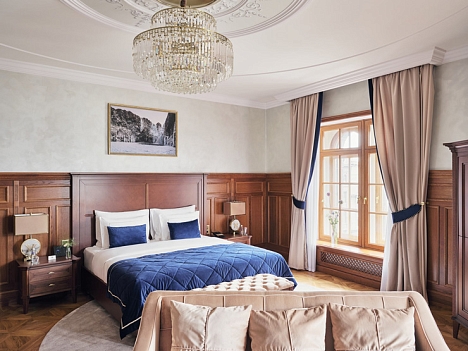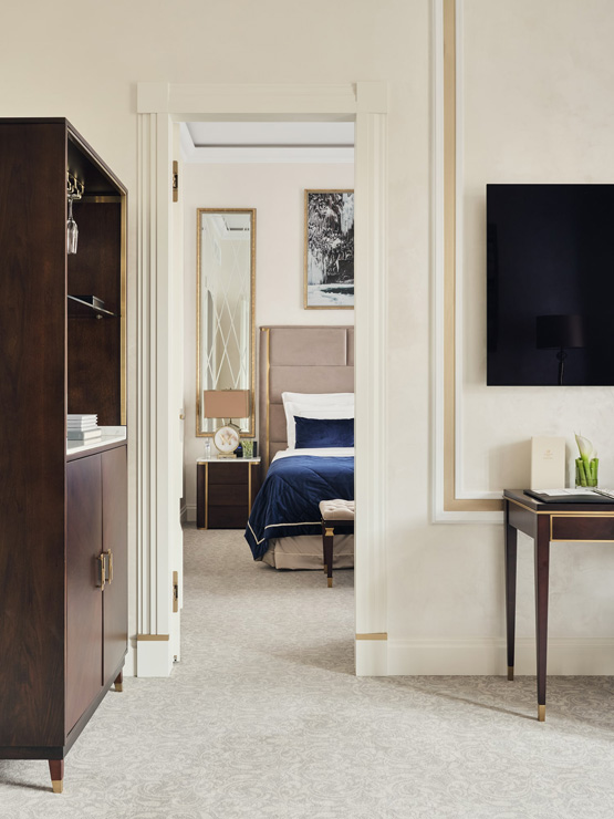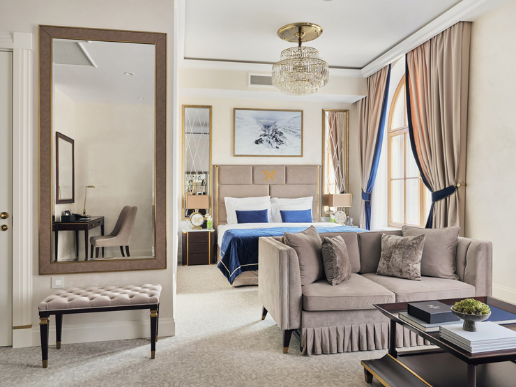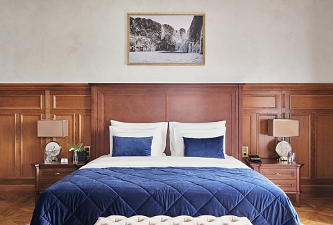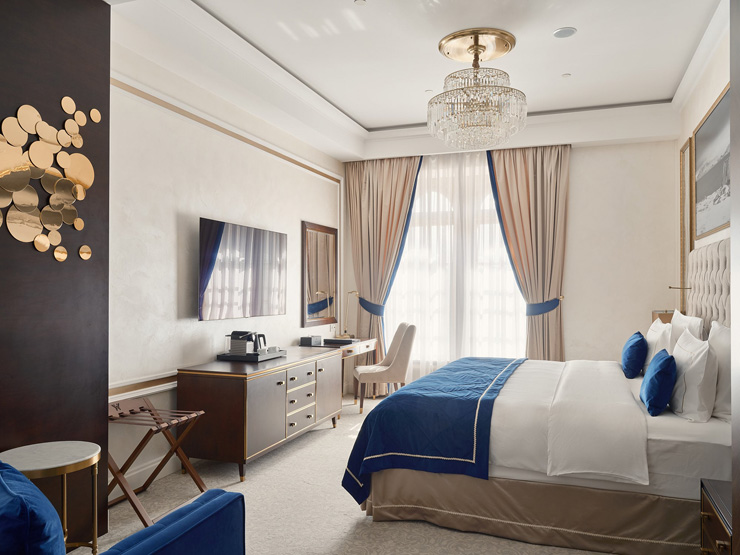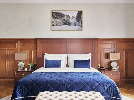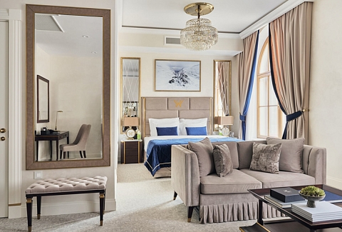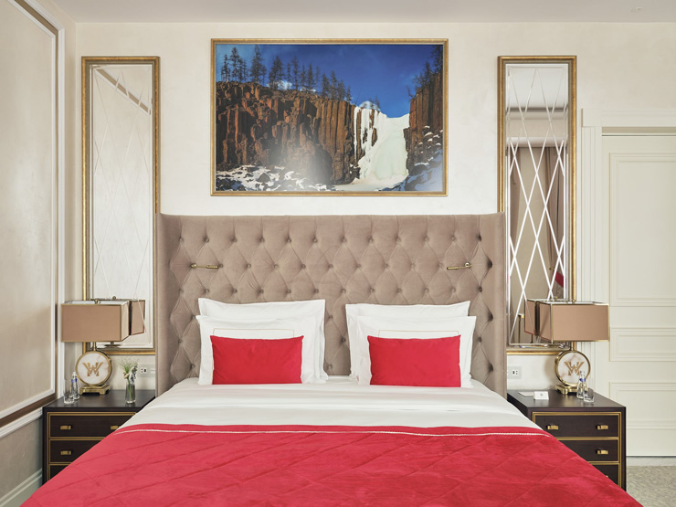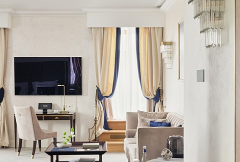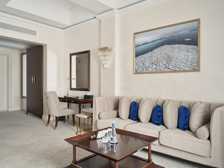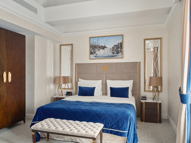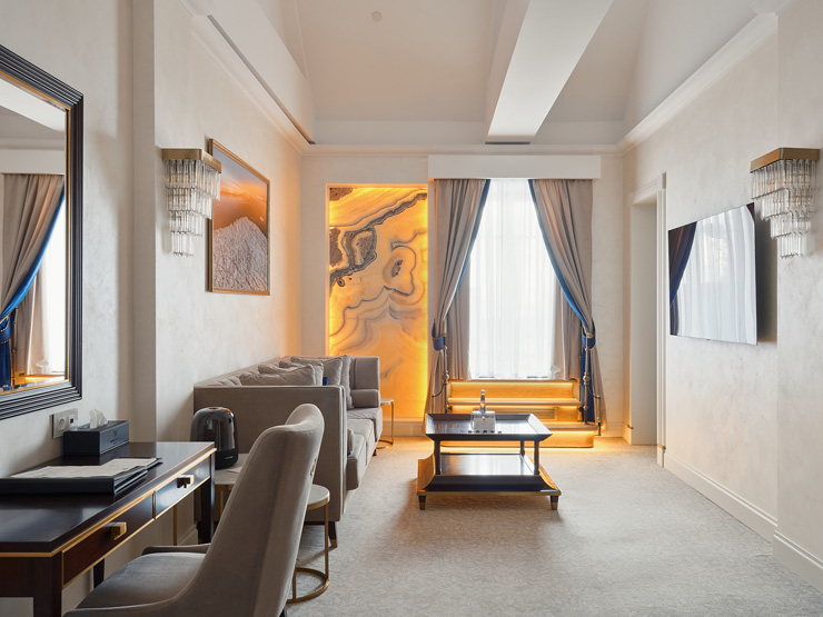 В номере: вешалка, диван, зеркало, кровать двуспальная, прикроватные тумбочки, стол, стулья, шкаф, кофемашина, мини-холодильник, сейф, сплит-система, телевизор, телефон, чайный набор посуды