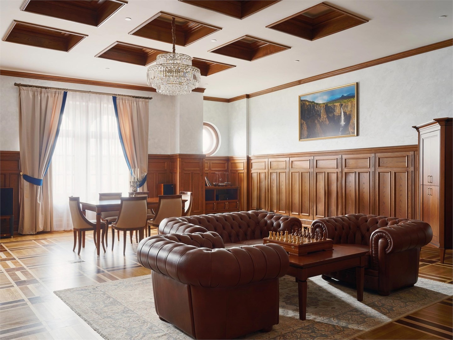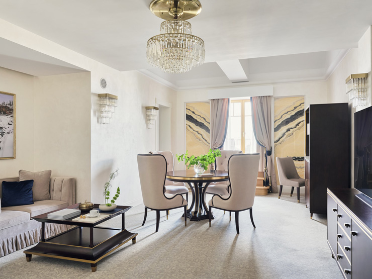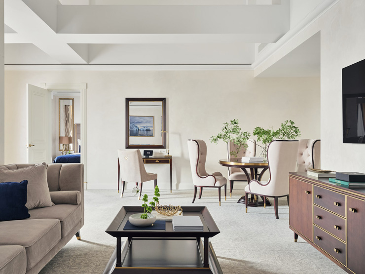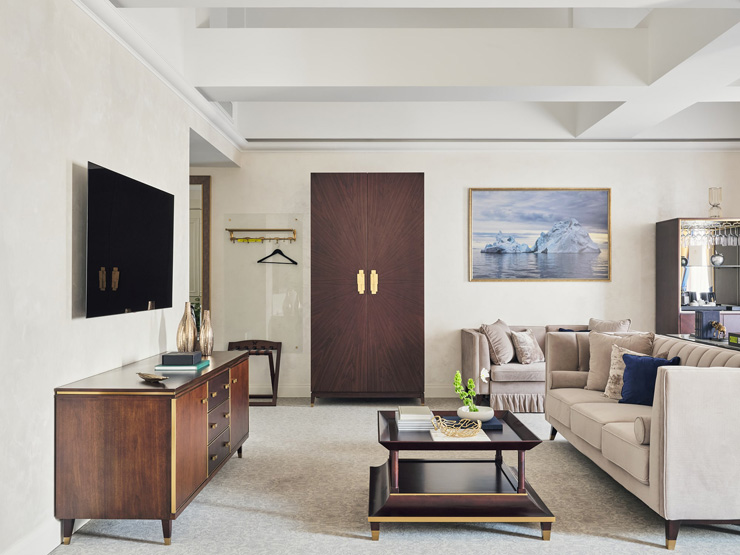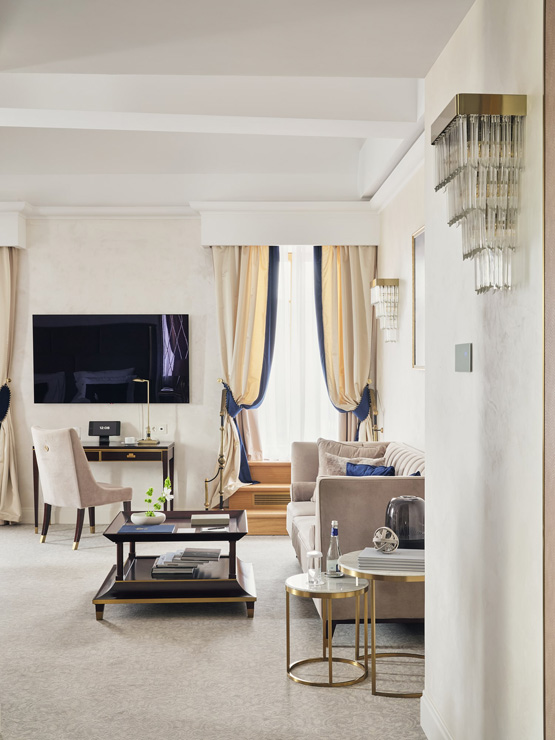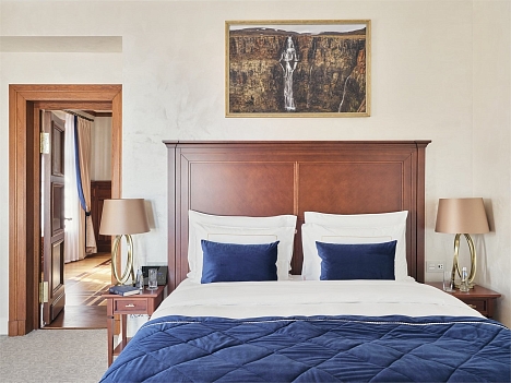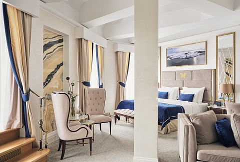 В номере: вешалка, диван, зеркало, кресла, кровать двуспальная, прикроватные тумбочки, стол, столик журнальный, стол обеденный, стулья, шкаф, кондиционер, кофемашина, мини-холодильник, телевизор, утюг, чайный набор посуды, электрочайник