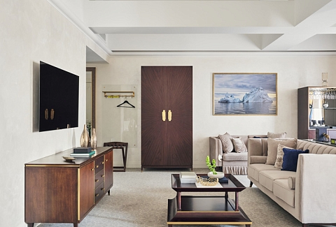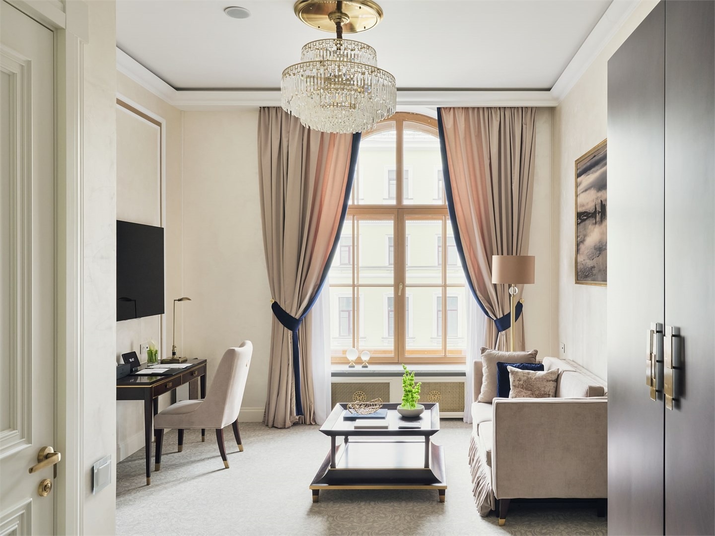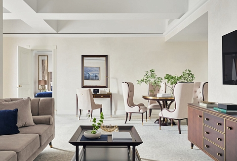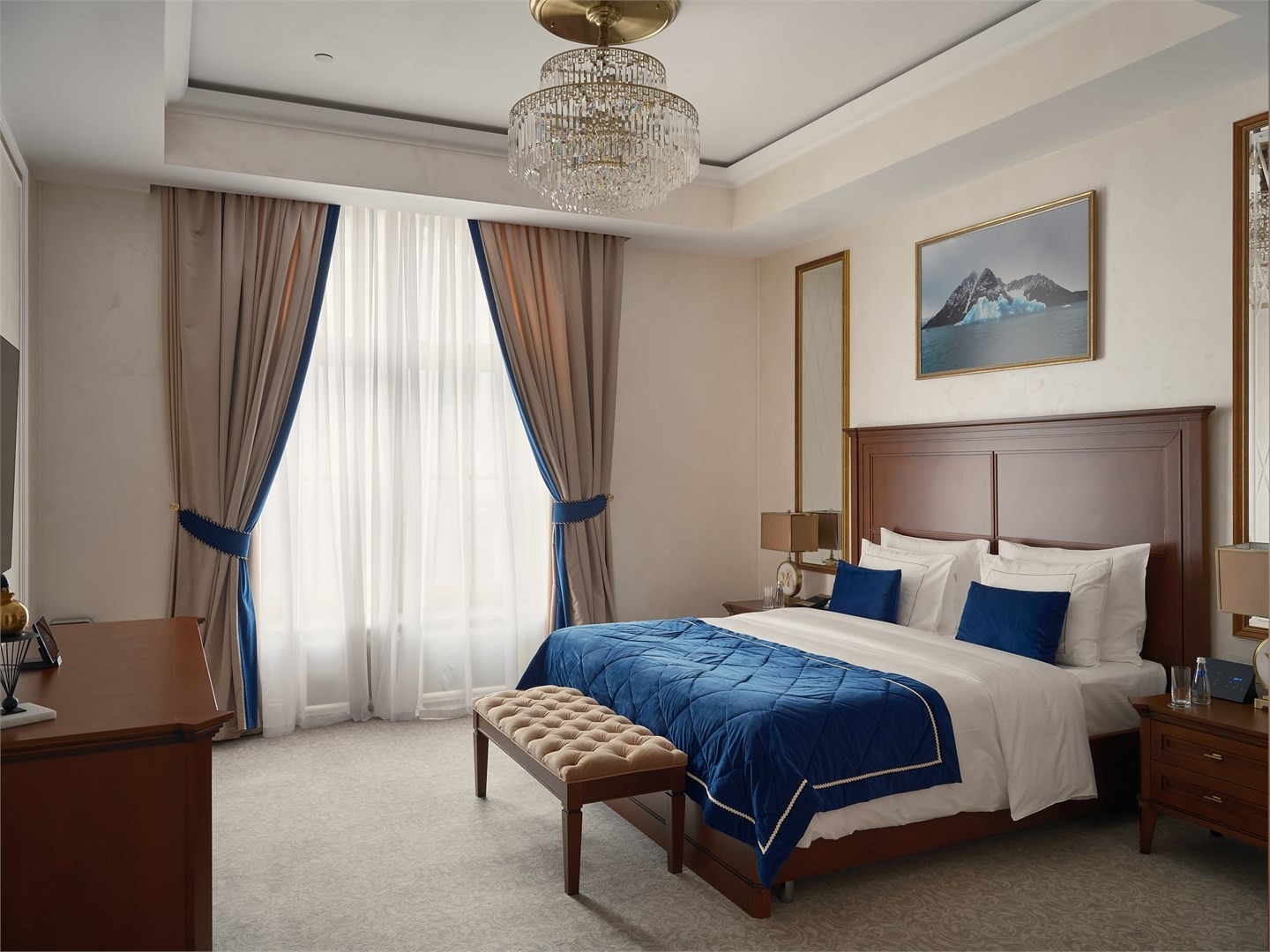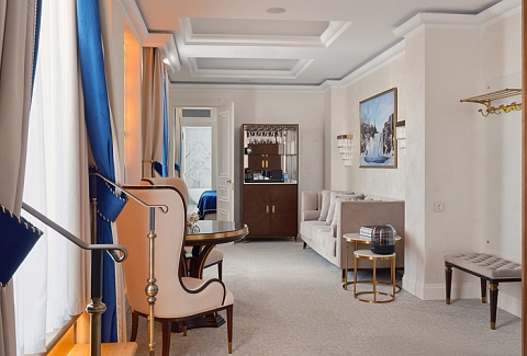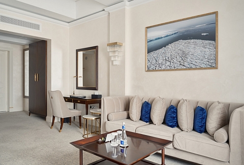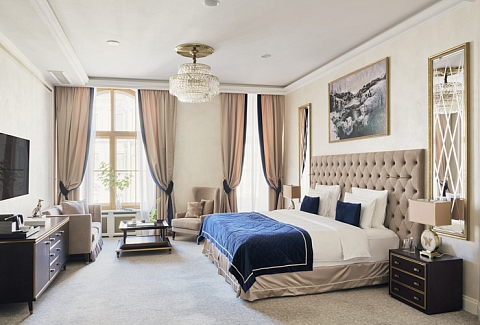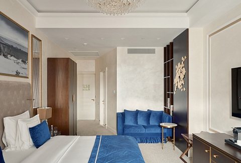В номере: вешалка, диван раскладной, зеркало, кресла, кровать двуспальная, прикроватные тумбочки, стол, столик журнальный, шкаф, кондиционер, кофемашина, мини-холодильник, телевизор, утюг, чайник