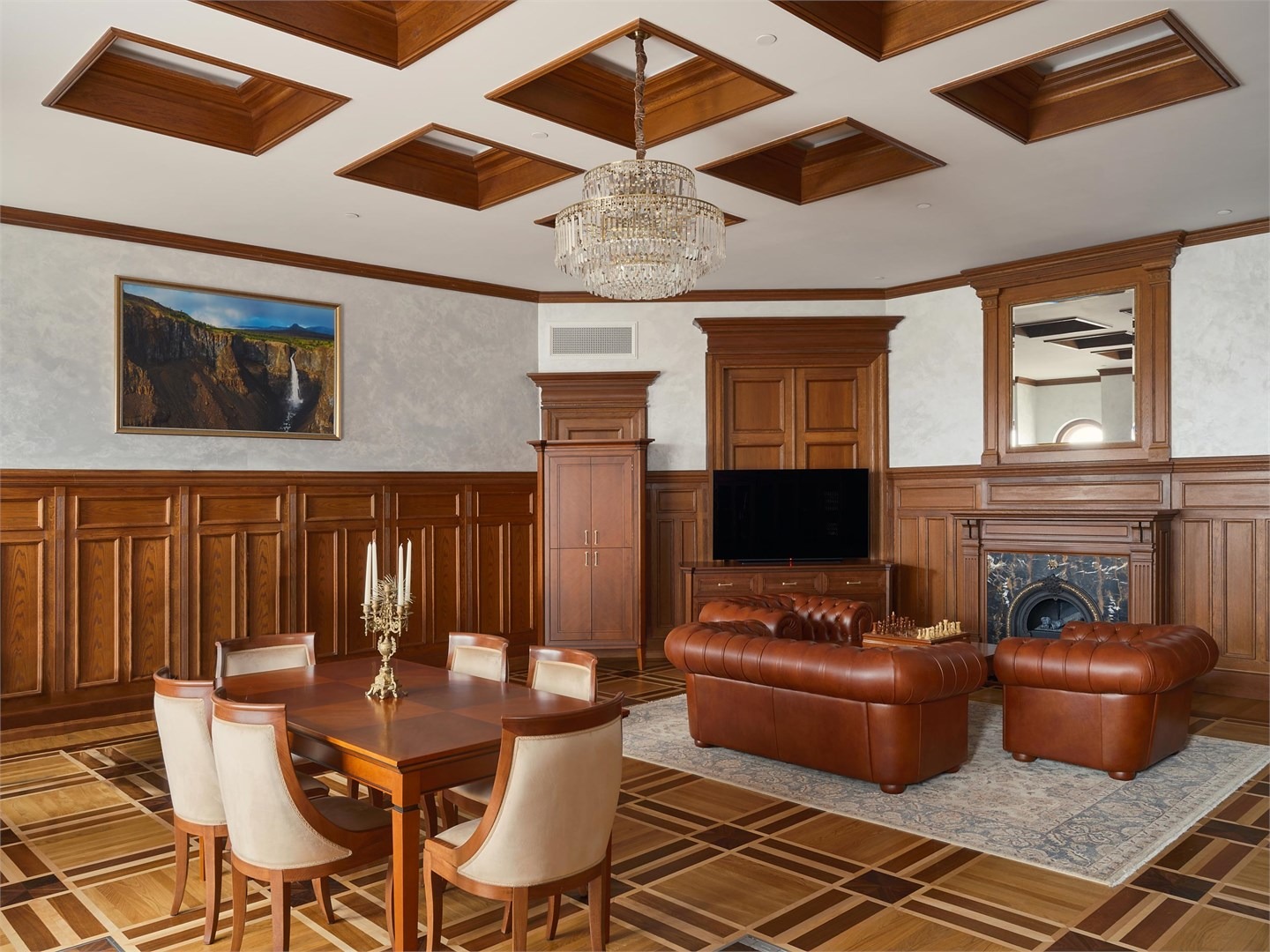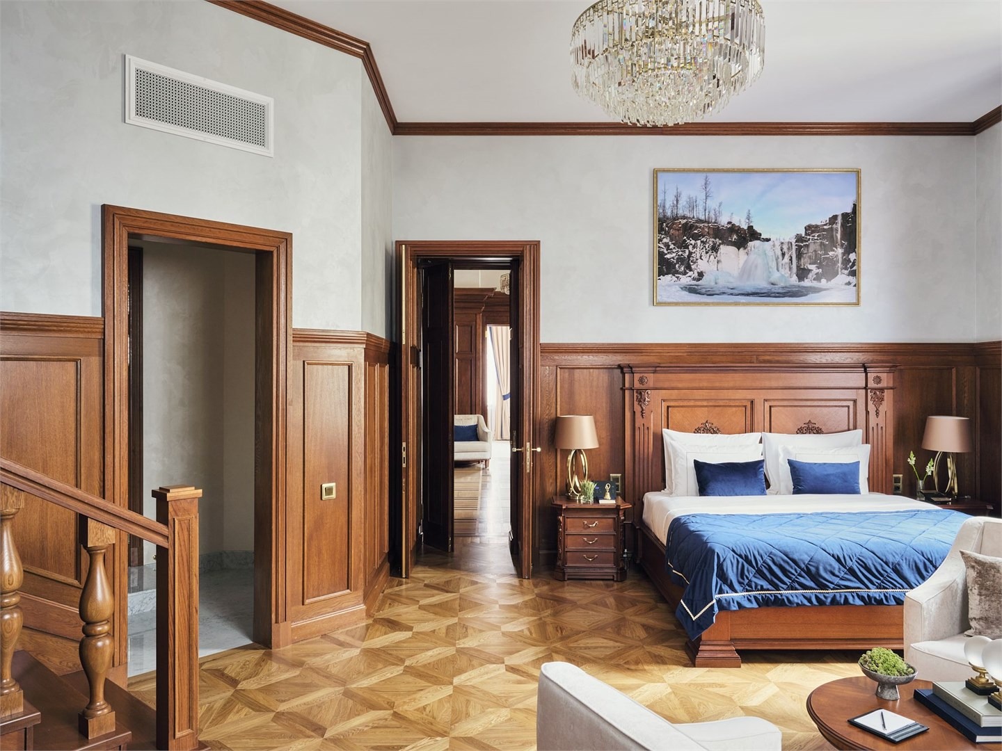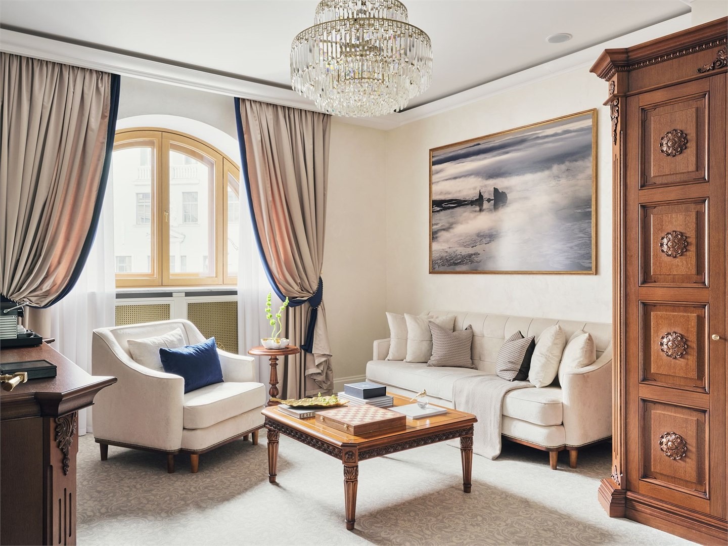 В номере: вешалка, диван раскладной, зеркало, кресла, кровать двуспальная, прикроватные тумбочки, стол, столик журнальный, шкаф, кондиционер, кофемашина, мини-холодильник, телевизор, утюг, чайник