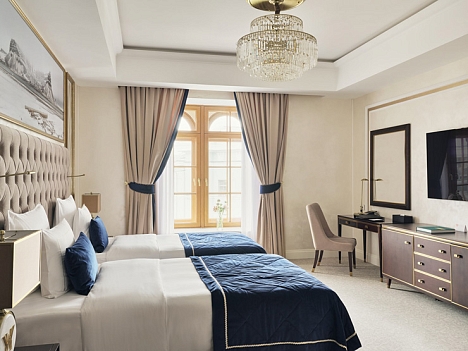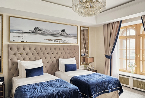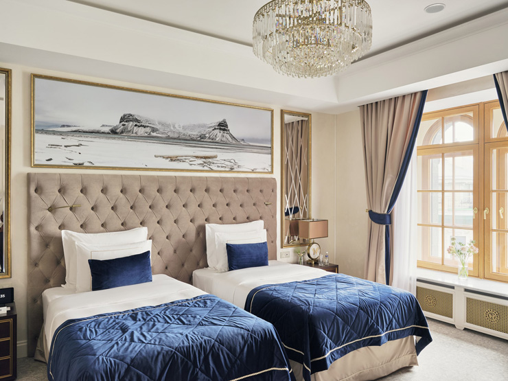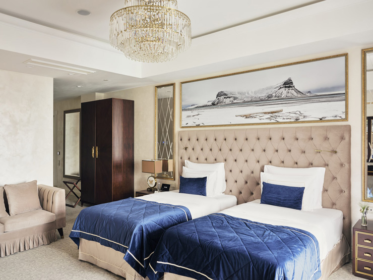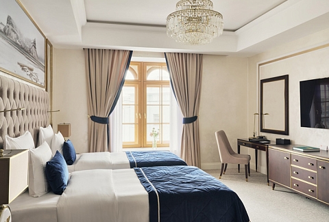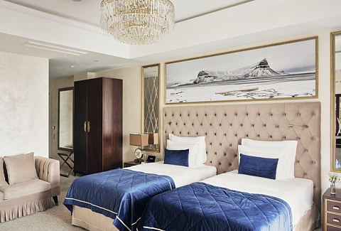 В номере: вешалка, диван, зеркало, кровати односпальные, прикроватные тумбочки, стол, стулья, шкаф, кофемашина, мини-холодильник, сейф, сплит-система, телевизор, телефон, чайный набор посуды