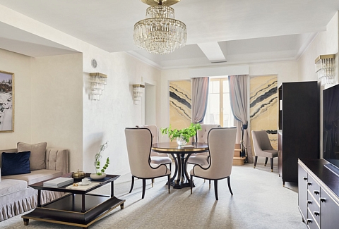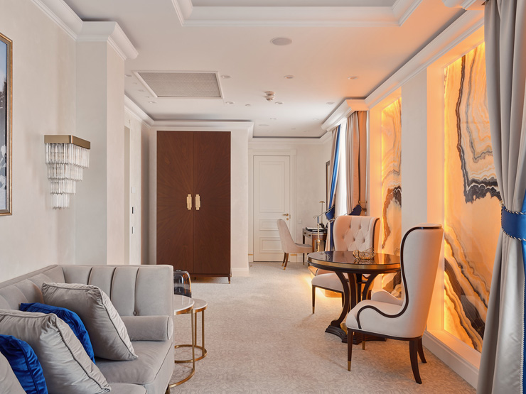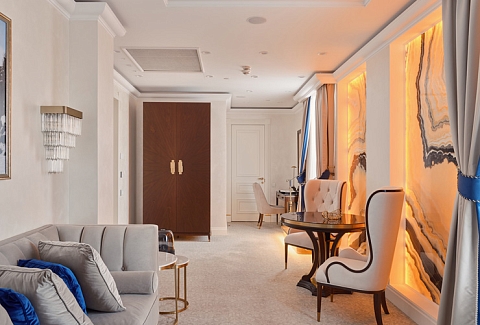 В номере: вешалка, диван, зеркало, кровать двуспальная, набор мягкой мебели, прикроватные тумбочки, стол, стол обеденный, стулья, шкаф, кондиционер, кофемашина, мини-холодильник, телевизор, утюг, чайный набор посуды, электрочайник