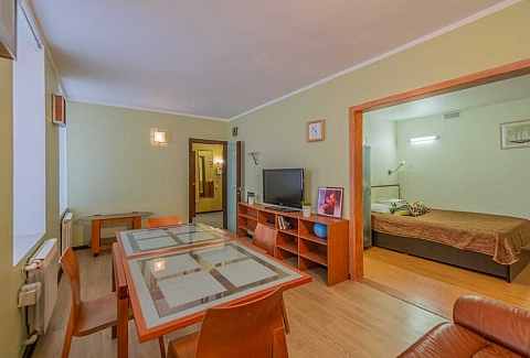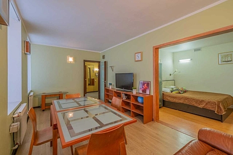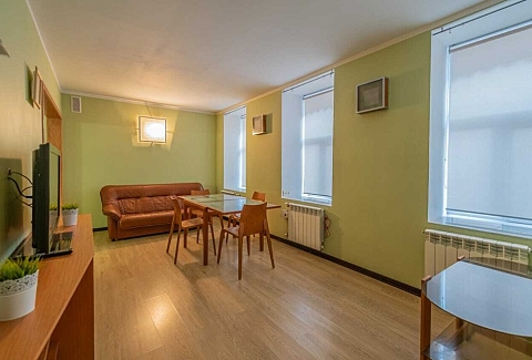 В номере: вешалка, диван раскладной, зеркало, кровать двуспальная, прикроватные тумбочки, стол, стулья, шкаф, гладильная доска, микроволновая печь, мини-холодильник, набор посуды, плита электрическая, стиральная машина, телевизор, утюг, электрочайник
