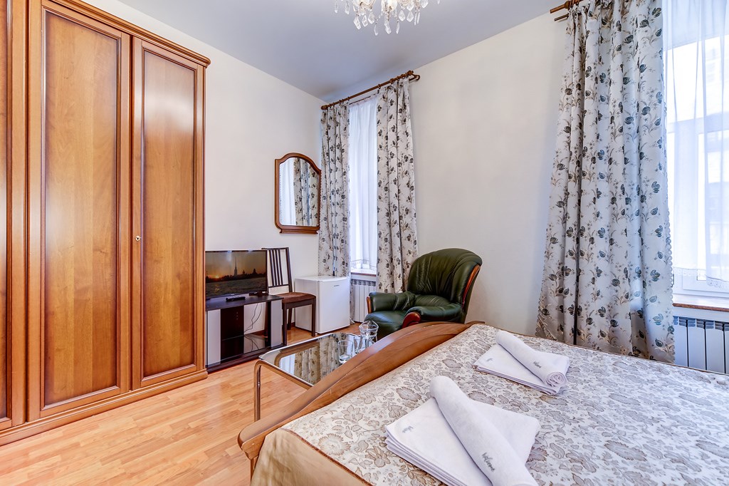 В номере: вешалка, зеркало, кресло, кровати односпальные /одна двуспальная кровать, прикроватные тумбочки, стол, стулья, шкаф, мини-холодильник, сплит-система, телевизор