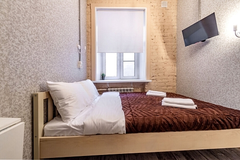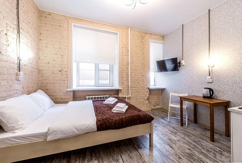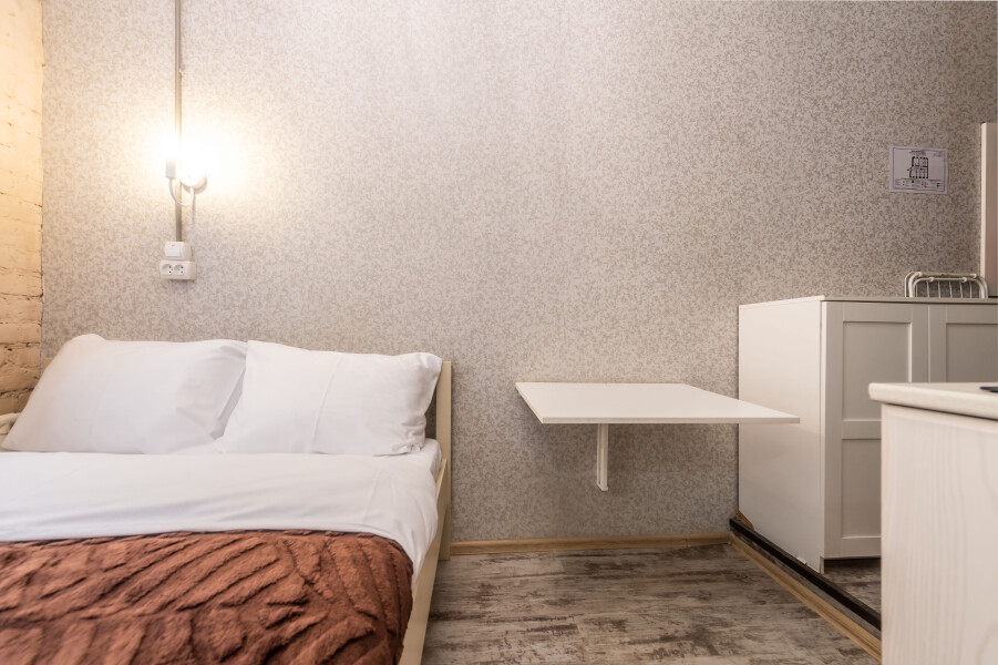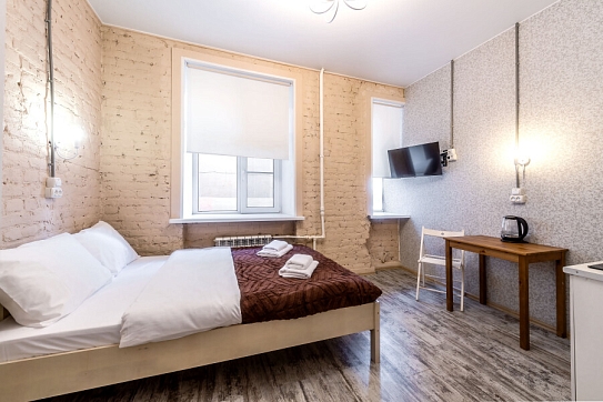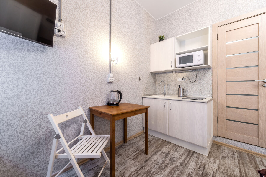 В номере: кровать двуспальная, стол, стул, микроволновая печь, мини-холодильник, набор посуды, плита электрическая, телевизор, электрочайник