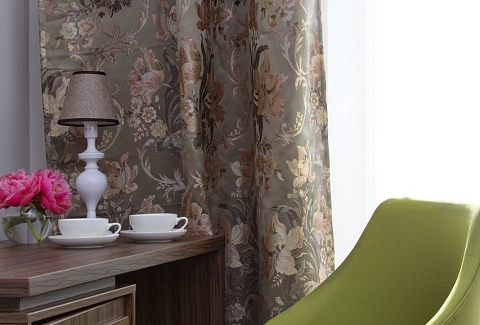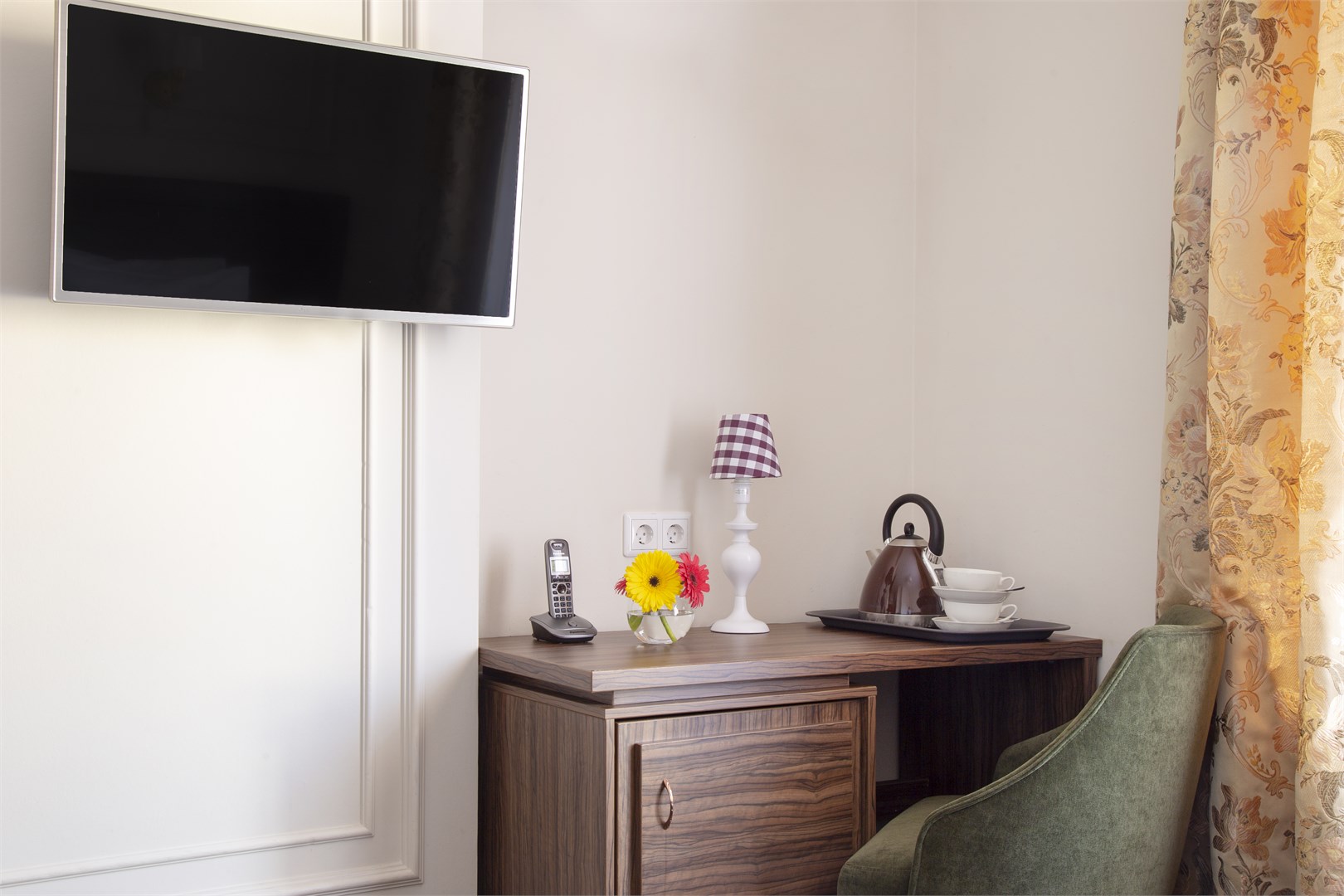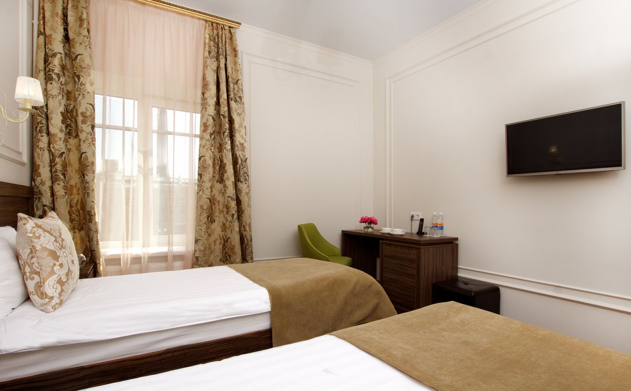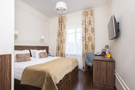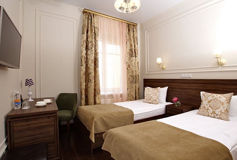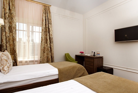 В номере: зеркало, кровати односпальные /одна двуспальная кровать, стол, стул, тумба багажная, шкаф, мини-холодильник, сейф, телевизор, телефон, чайный набор посуды
