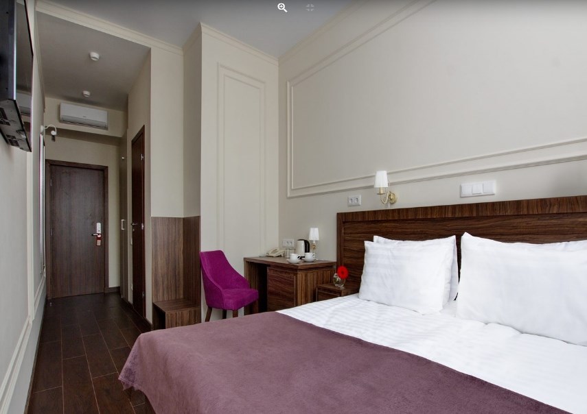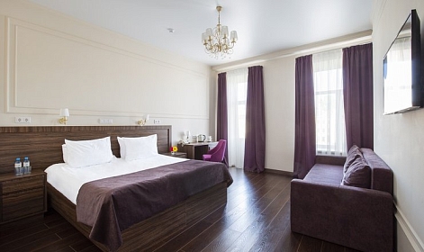 В номере: зеркало, кресло, кровать двуспальная, стол, шкаф, кондиционер, сейф, телевизор, телефон, чайный набор посуды, электрочайник