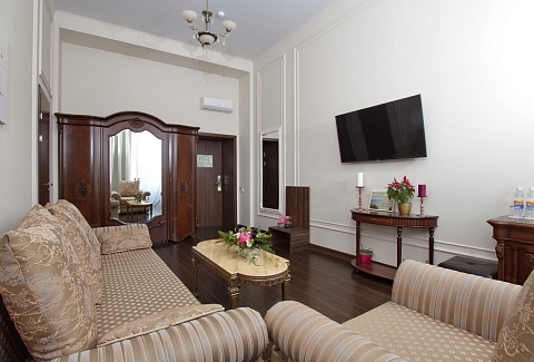 В номере: зеркало, кресло, кровать двуспальная, набор мягкой мебели, прикроватные тумбочки, столик журнальный, шкаф, кондиционер, кофемашина, мини-холодильник, сейф, телевизор, телевизор ЖК, чайный набор посуды, электрочайник