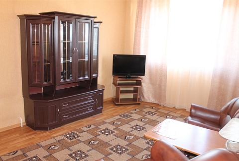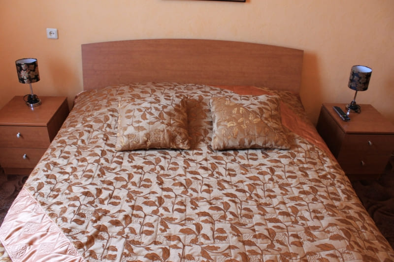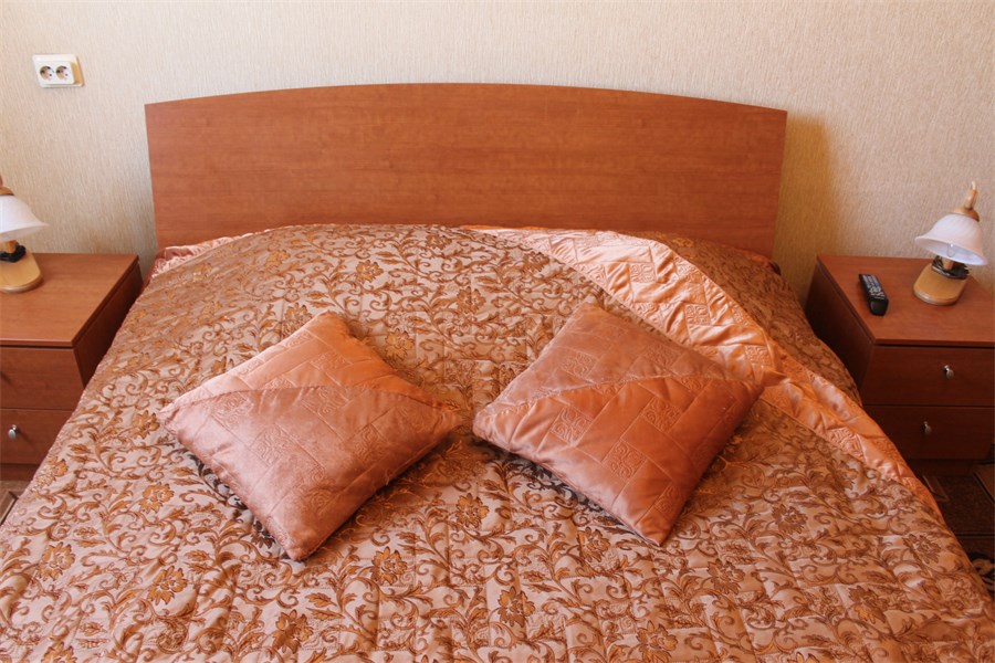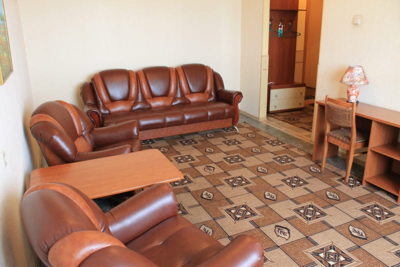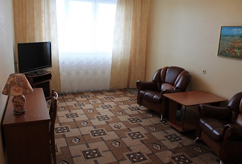 В номере: вешалка, диван, зеркало, кресла, кровать двуспальная, прикроватные тумбочки, стол, стулья, шкаф, набор посуды, телевизор, холодильник, чайный набор посуды, электрочайник