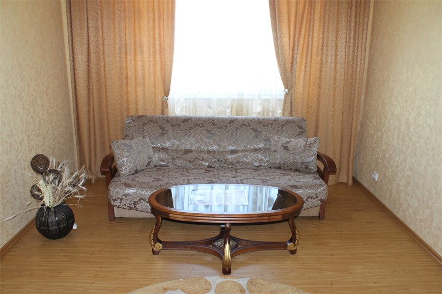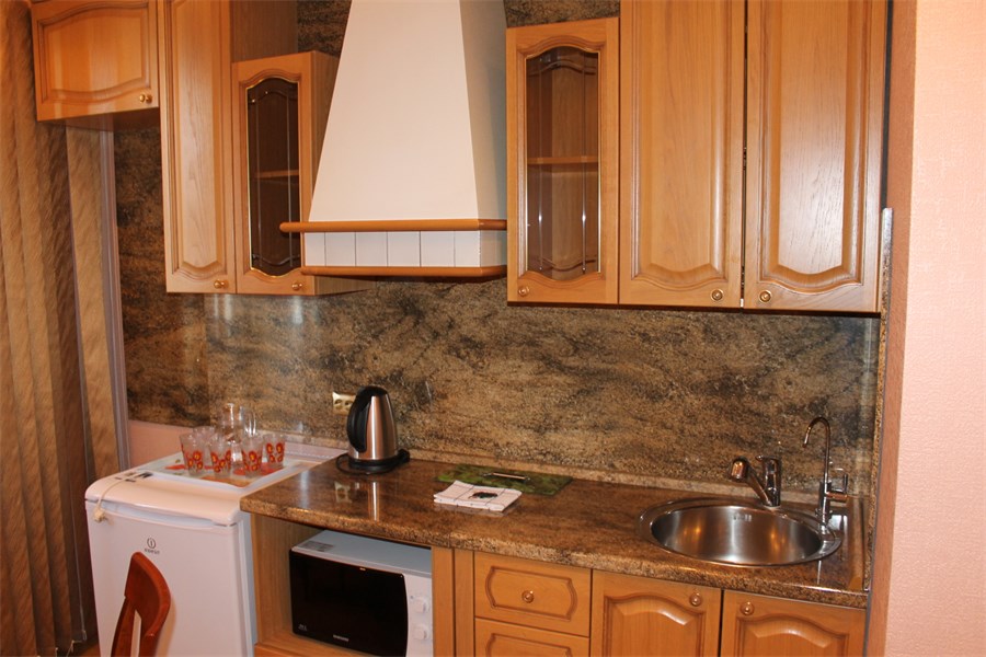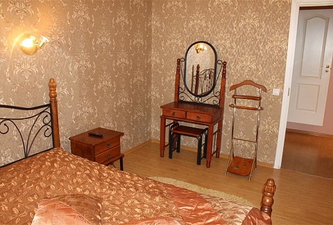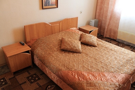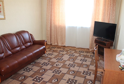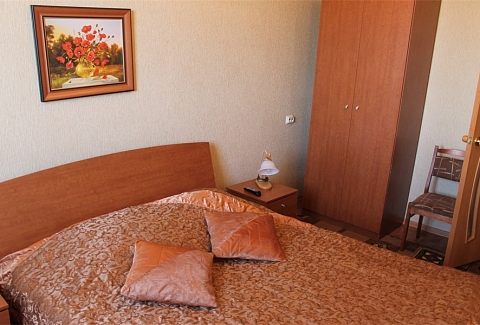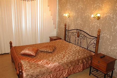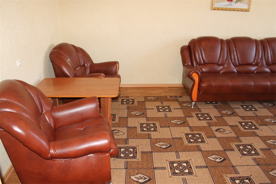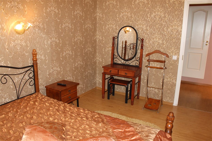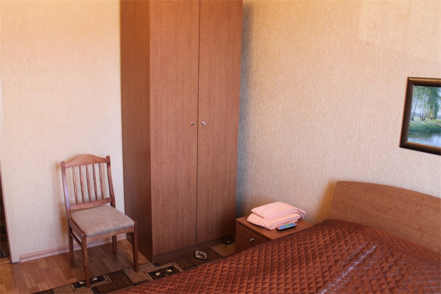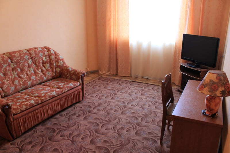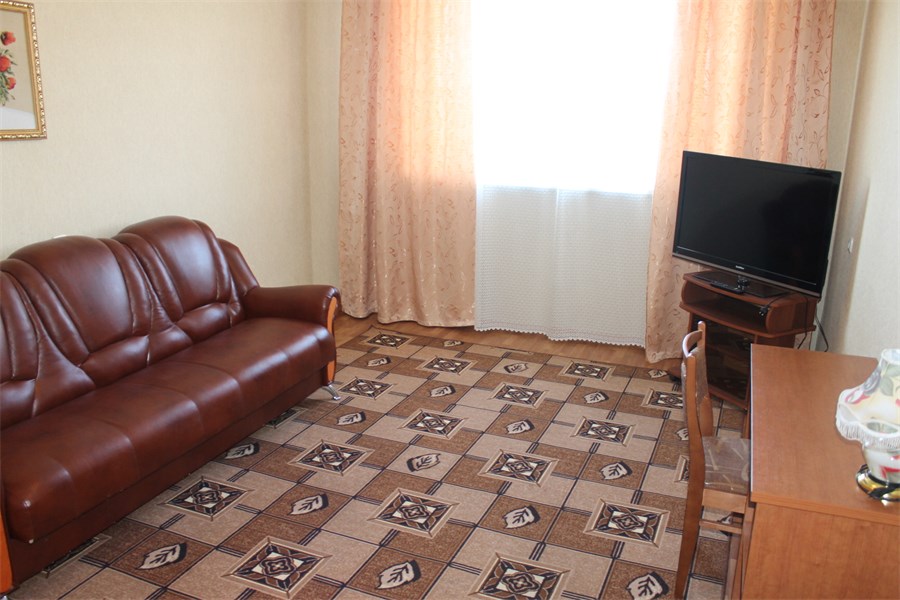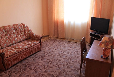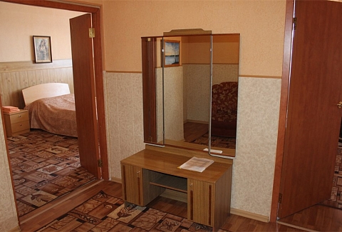 В номере: вешалка, диван, зеркало, кровать двуспальная, стол, столик журнальный, столик туалетный, стулья, шкаф, микроволновая печь, набор посуды, сейф, телевизор, холодильник, чайный набор посуды, электрочайник