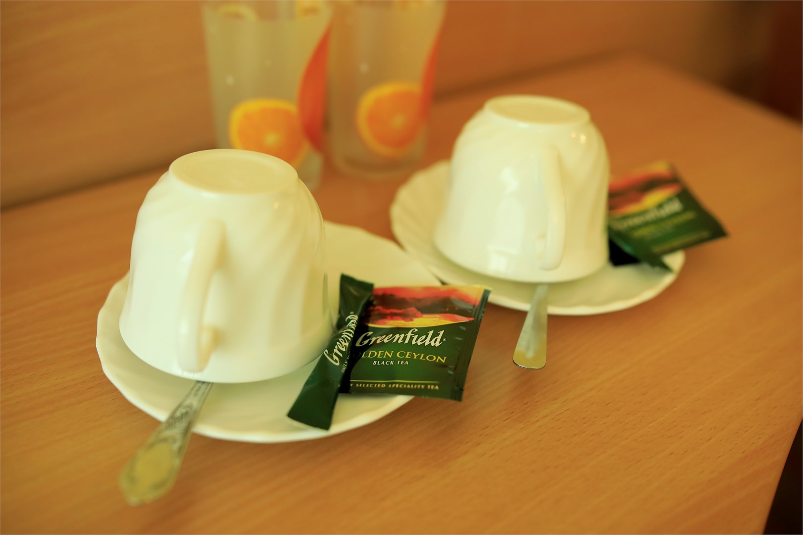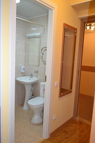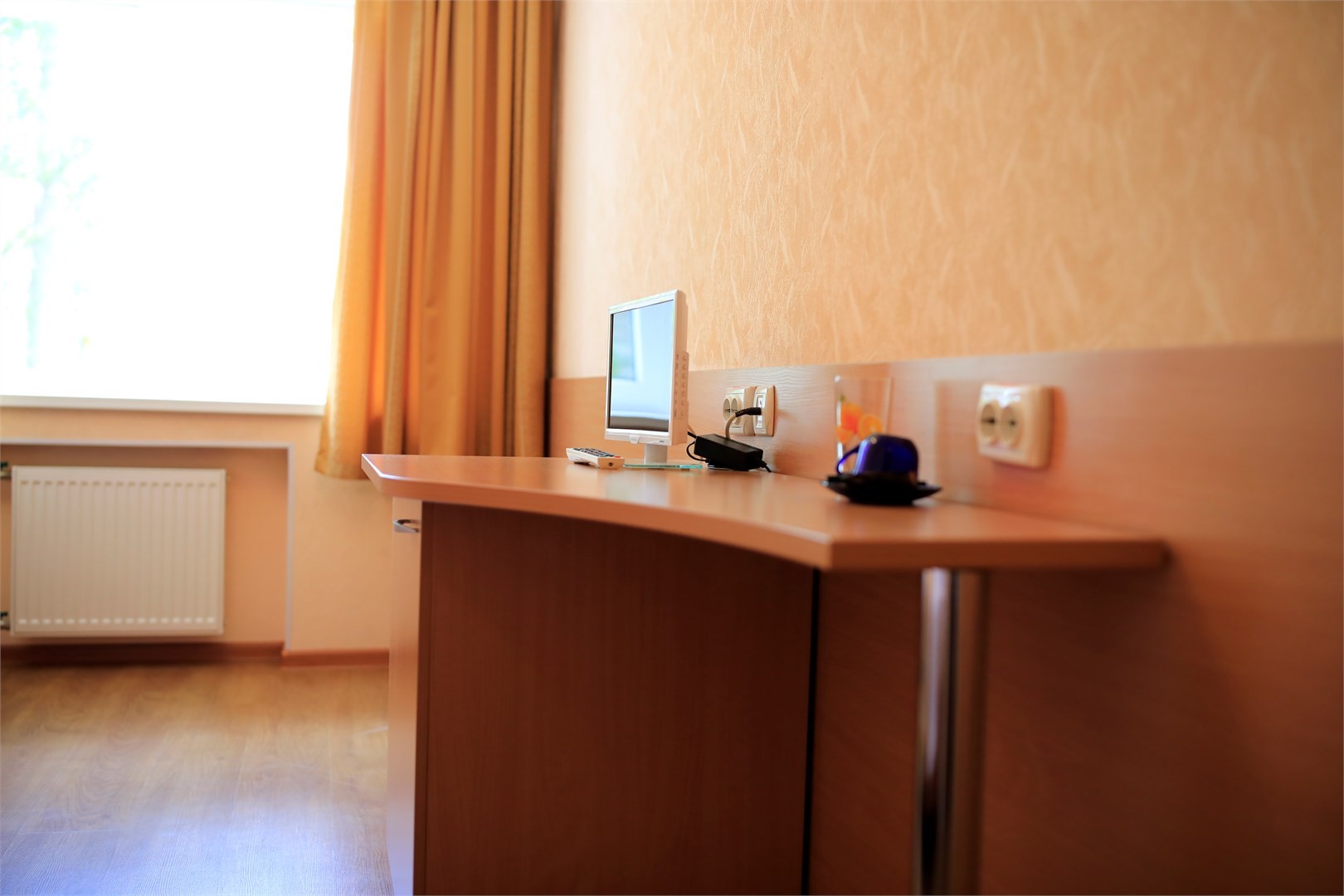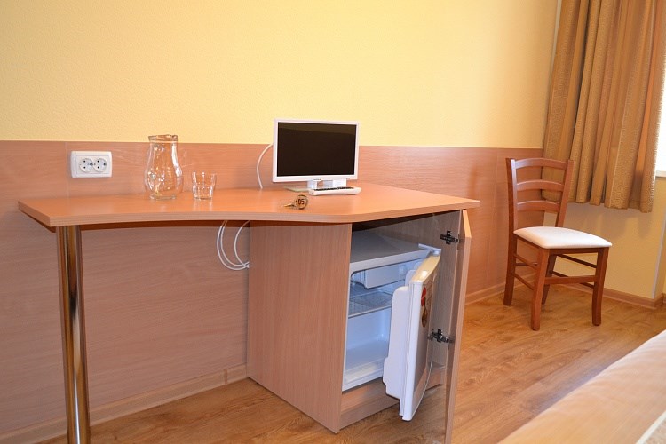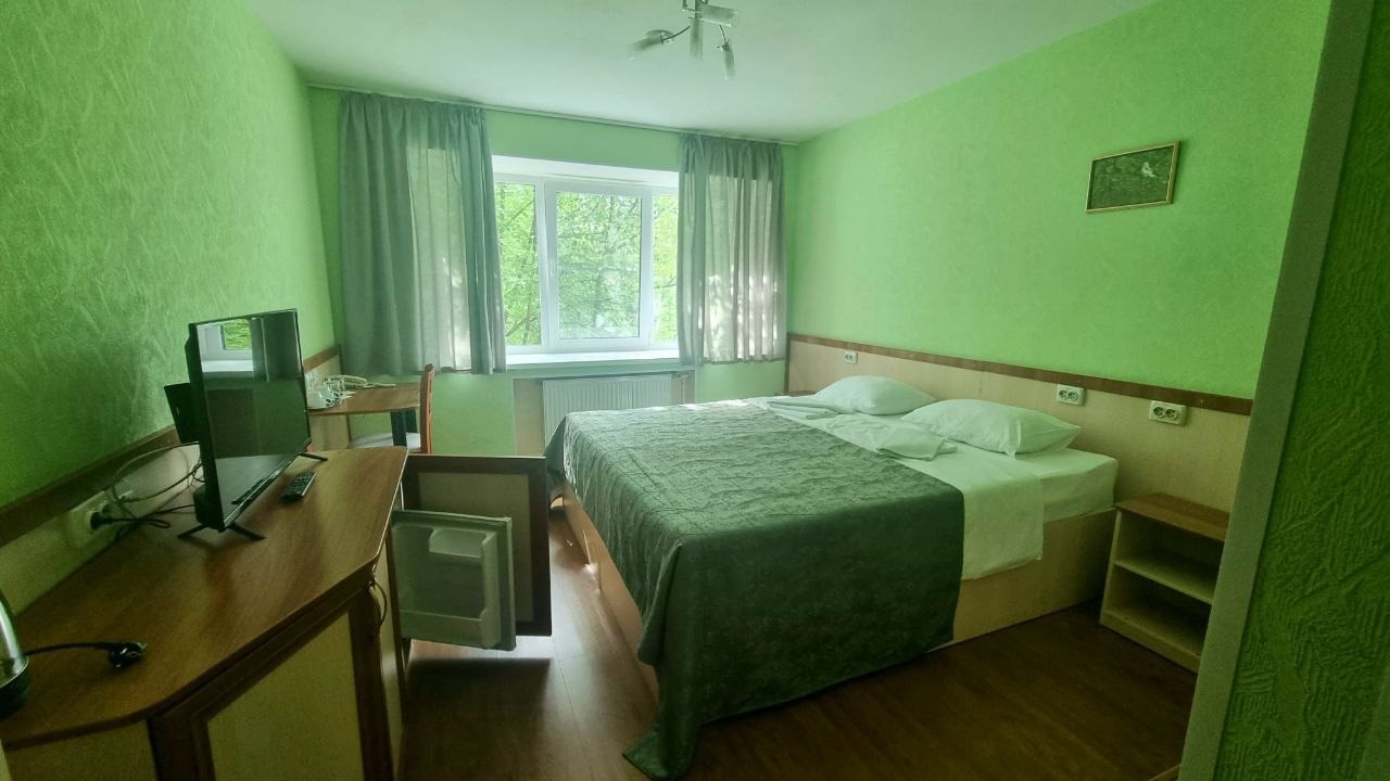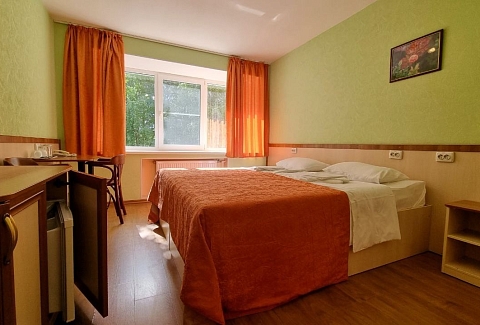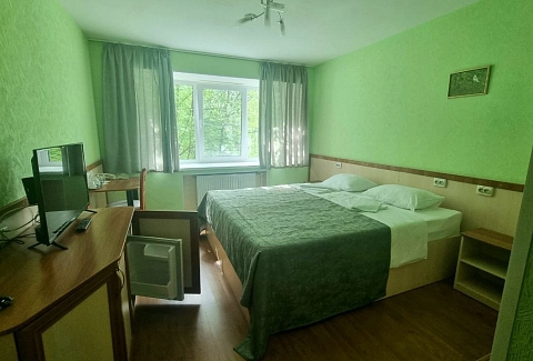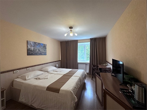 В номере: вешалка, зеркало, кровать двуспальная, прикроватные тумбочки, стол, стулья, шкаф, мини-холодильник, телевизор, телефон