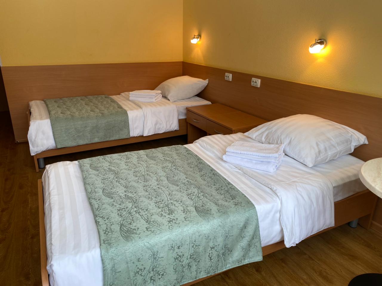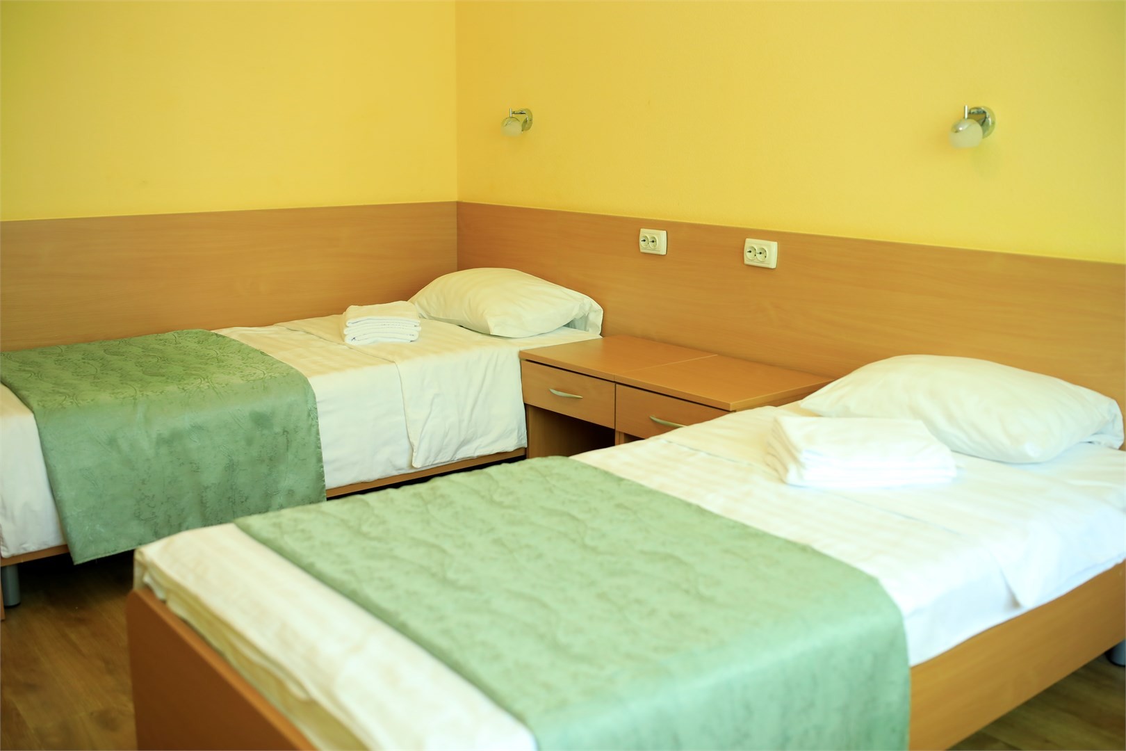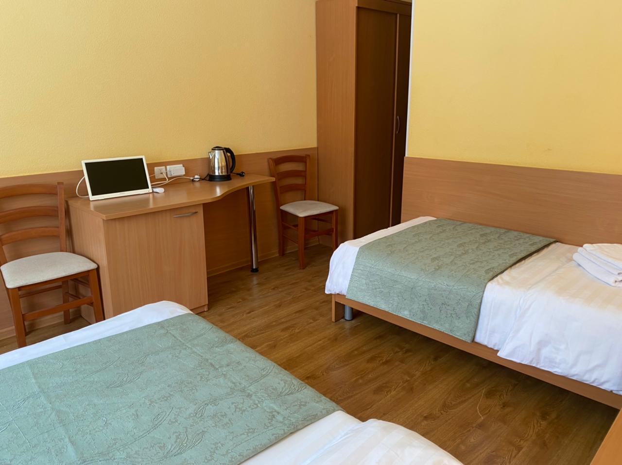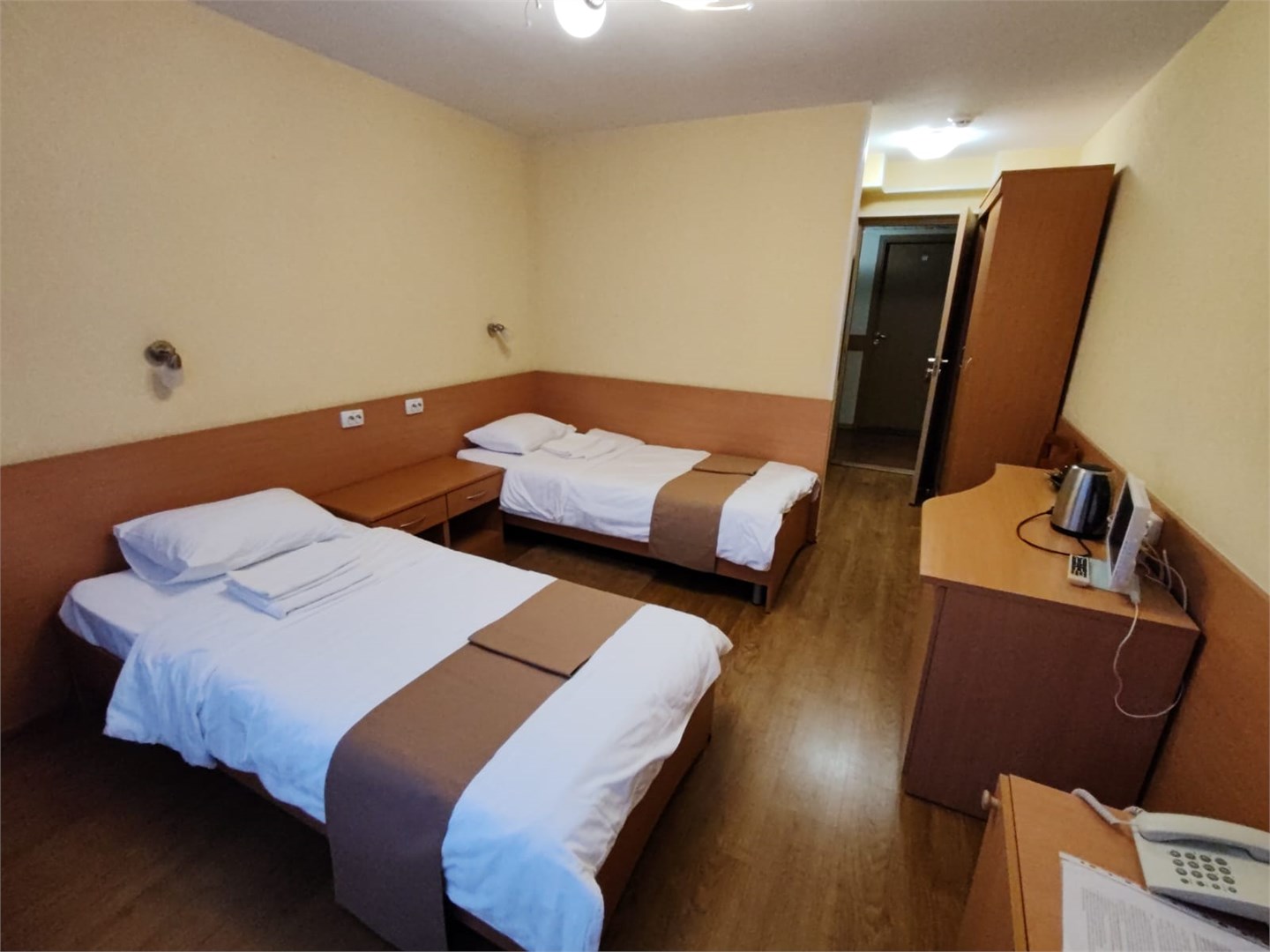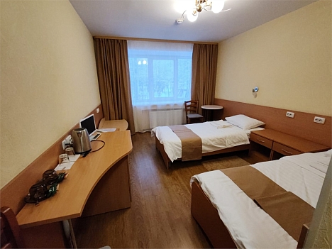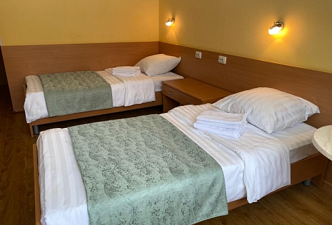 В номере: вешалка, зеркало, кровати односпальные /одна двуспальная кровать, прикроватные тумбочки, стол, стулья, шкаф, телевизор, телефон, холодильник