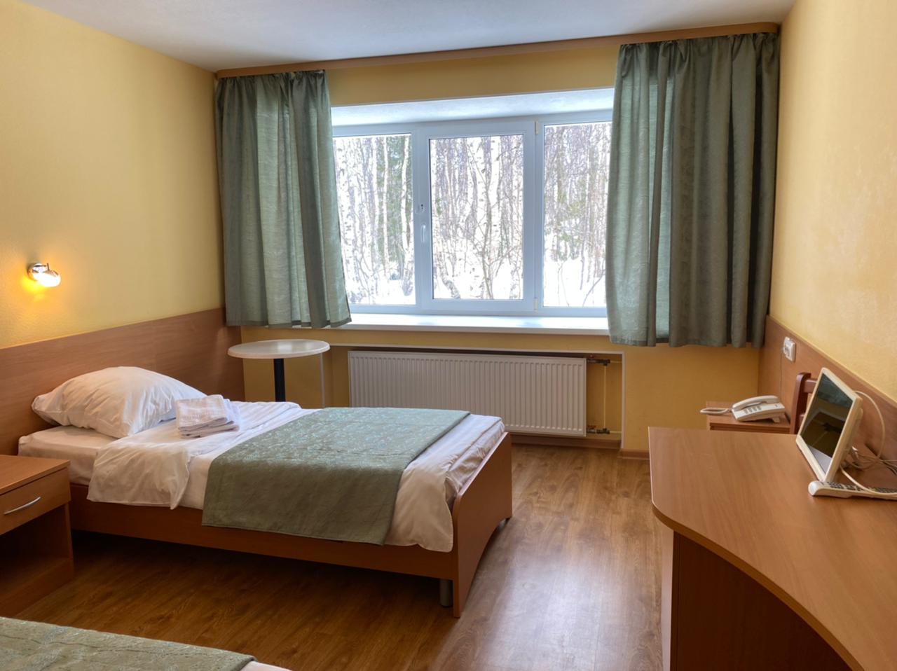 В номере: вешалка, зеркало, кровати односпальные, прикроватные тумбочки, стол, стулья, шкаф, телевизор, телефон, холодильник
