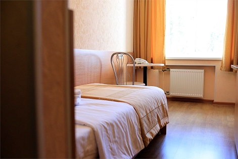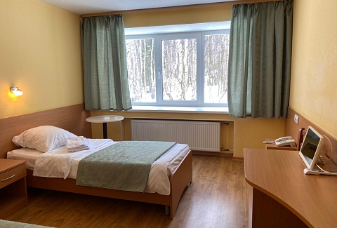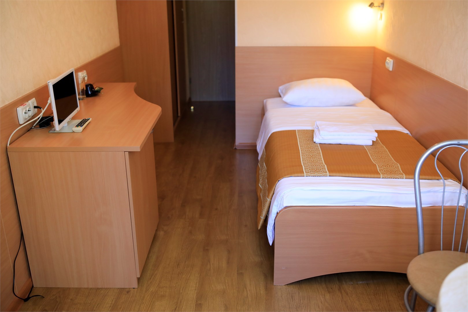 В номере: вешалка, зеркало, кровать односпальная, прикроватные тумбочки, стол, стулья, шкаф, телевизор, телефон, холодильник