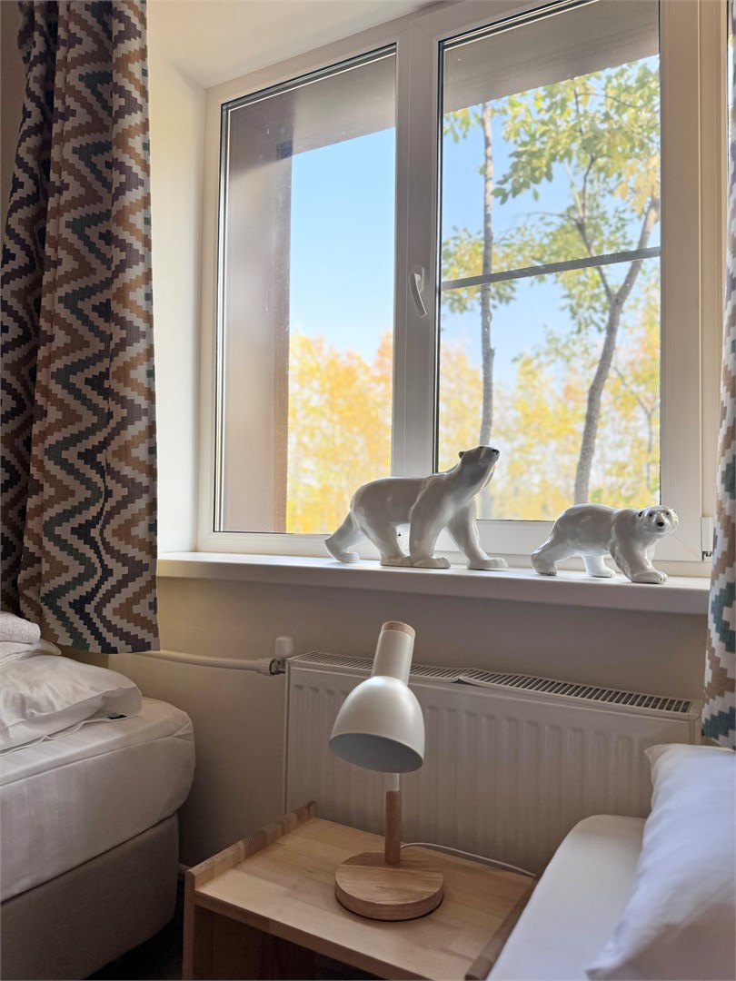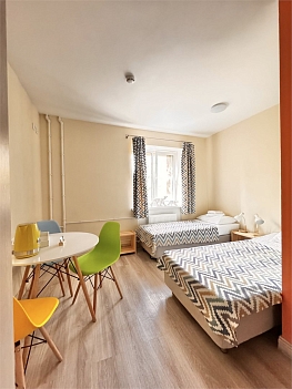 В номере: зеркало, кровати односпальные, прикроватные тумбочки, стол, стулья, шкаф, микроволновая печь, набор посуды, телевизор ЖК, холодильник, электрочайник