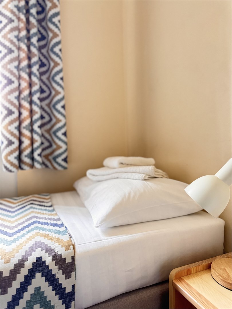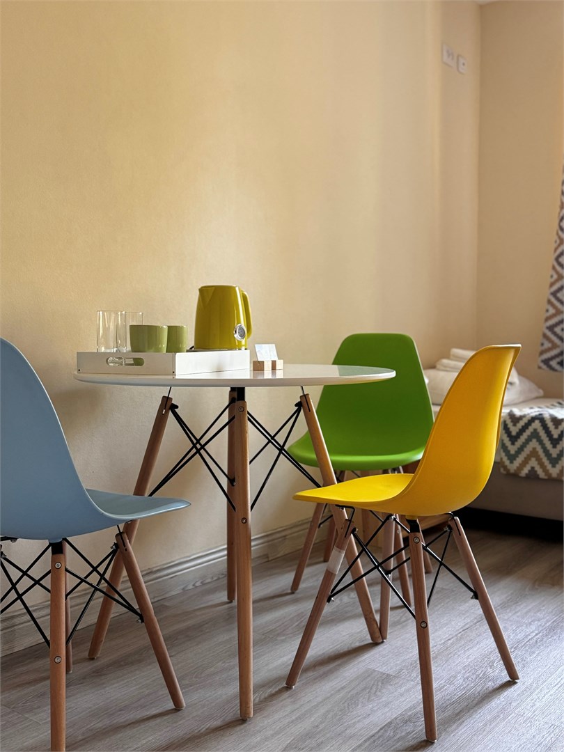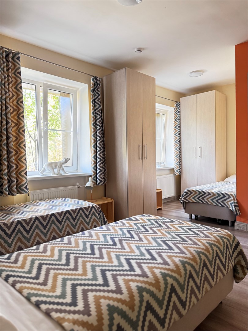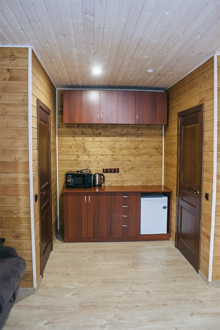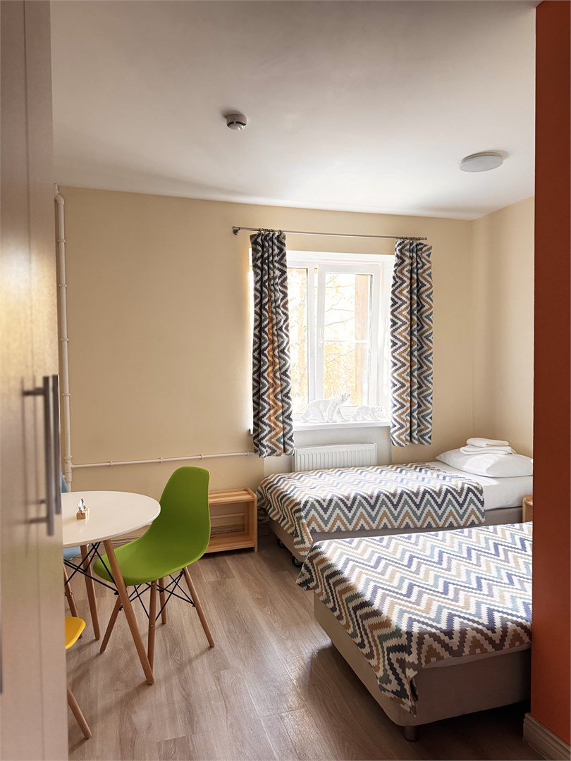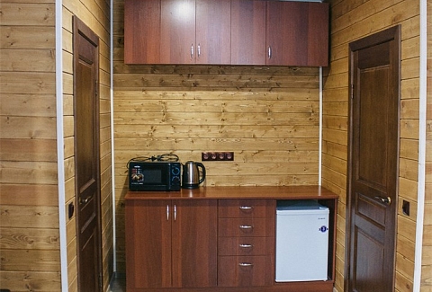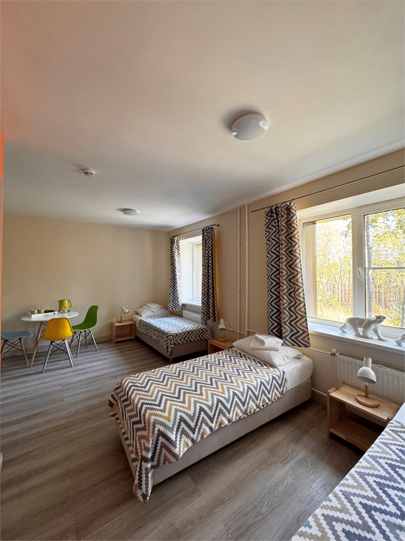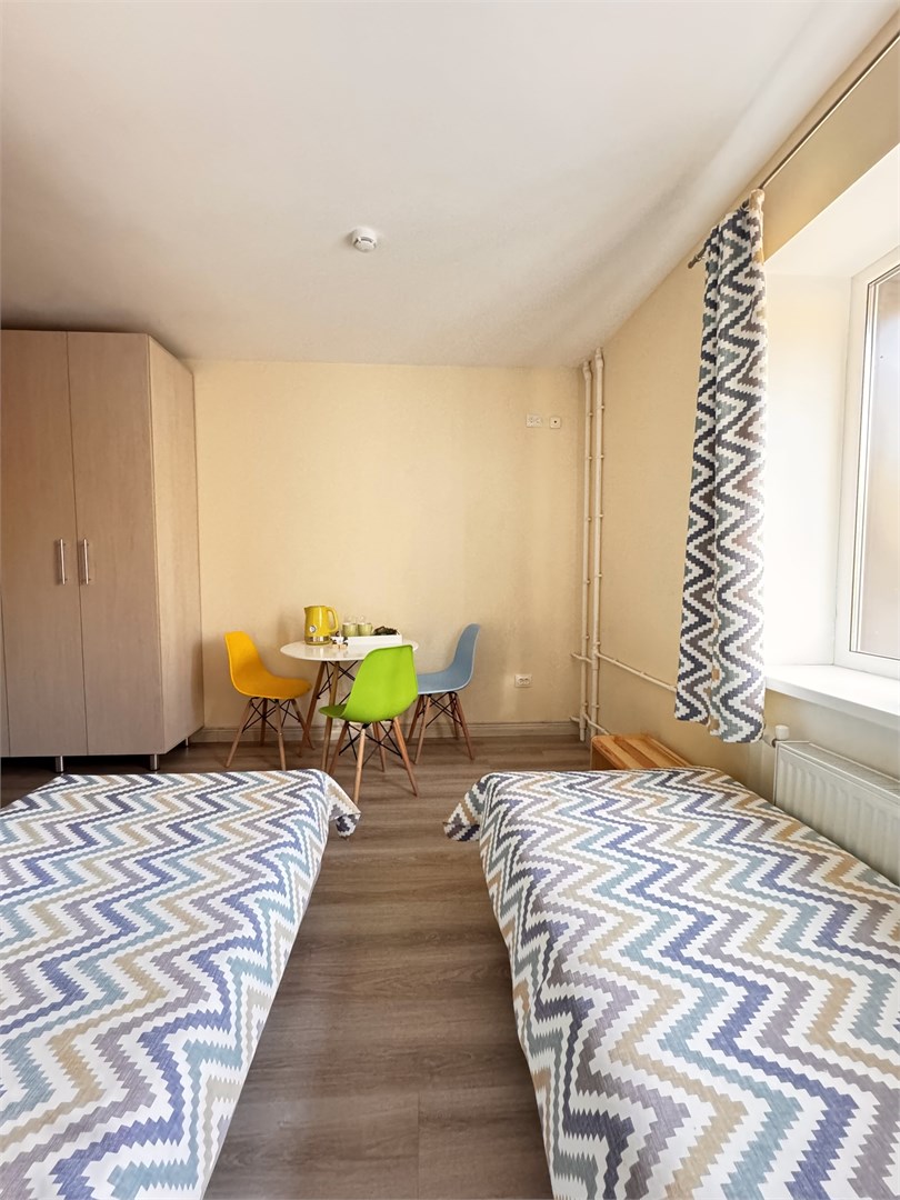 В номере: зеркало, кровати односпальные, прикроватные тумбочки, стол, стулья, шкаф, микроволновая печь, набор посуды, холодильник, электрочайник
