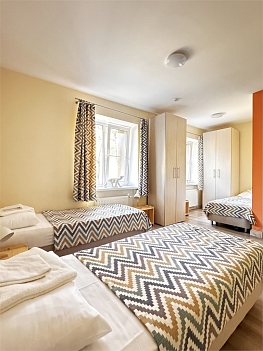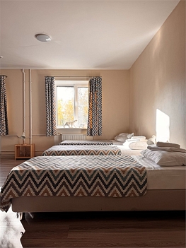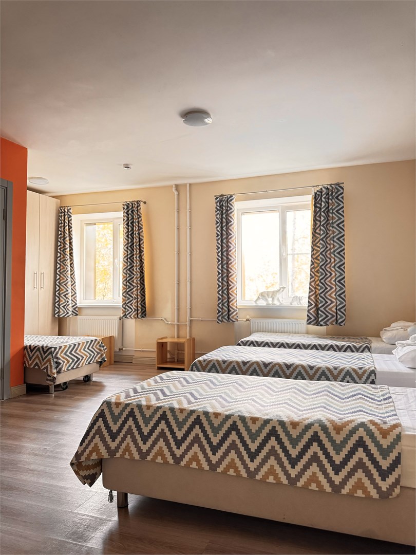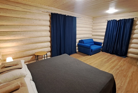 В номере: вешалка, зеркало, комод, кровати односпальные /одна двуспальная кровать, прикроватная тумбочка, стол, стулья, набор посуды, теплый пол