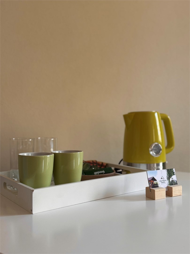 В номере: зеркало, кровати односпальные, прикроватные тумбочки, стол, стулья, шкаф, микроволновая печь, набор посуды, телевизор, электрочайник