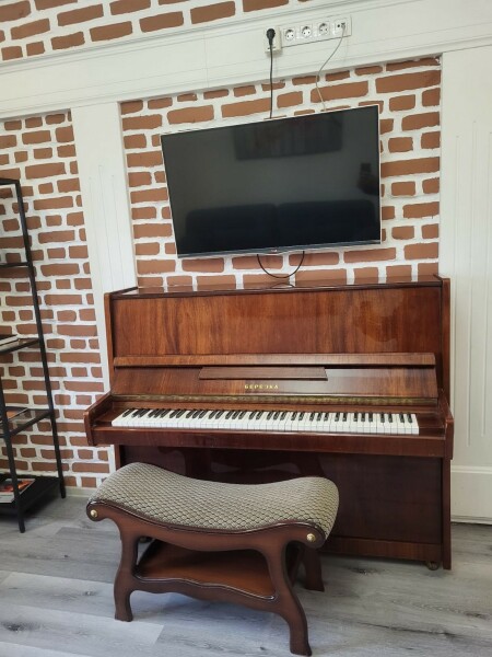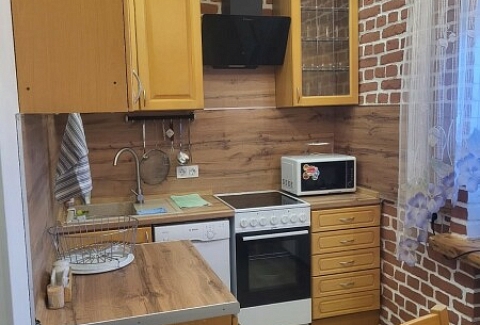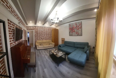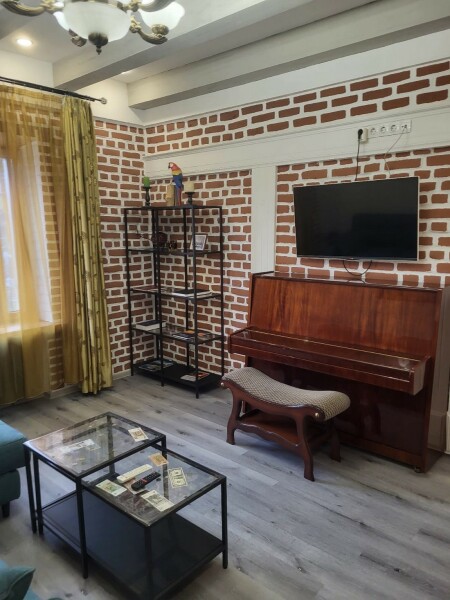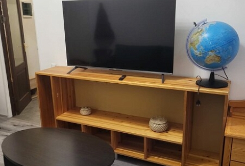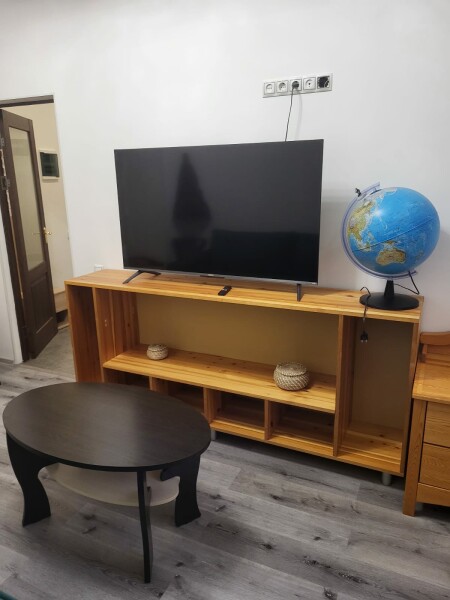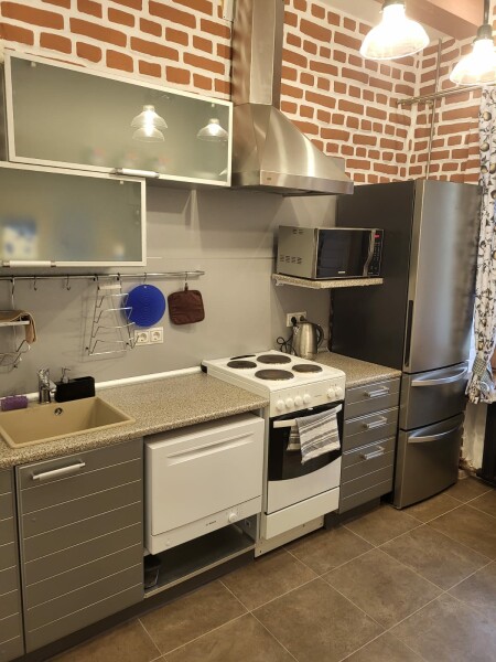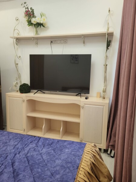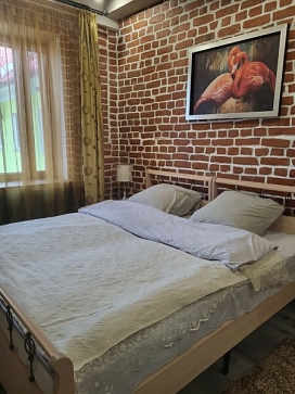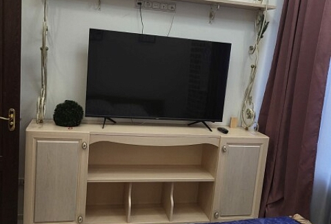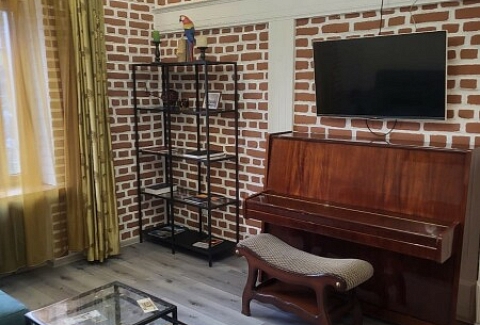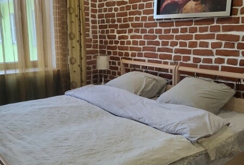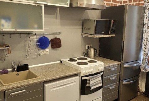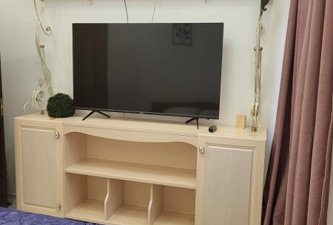 В номере: диван раскладной, кровать двуспальная, стол, стулья, шкаф, гладильная доска, духовой шкаф, микроволновая печь, набор посуды, плита электрическая, стиральная машина, телевизор, утюг, холодильник, чайник