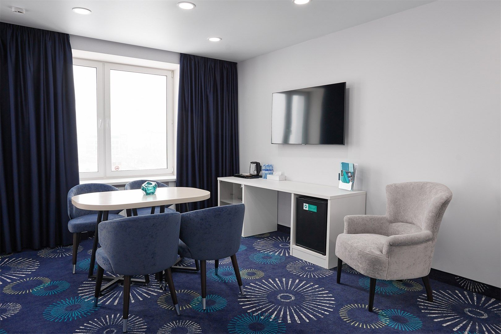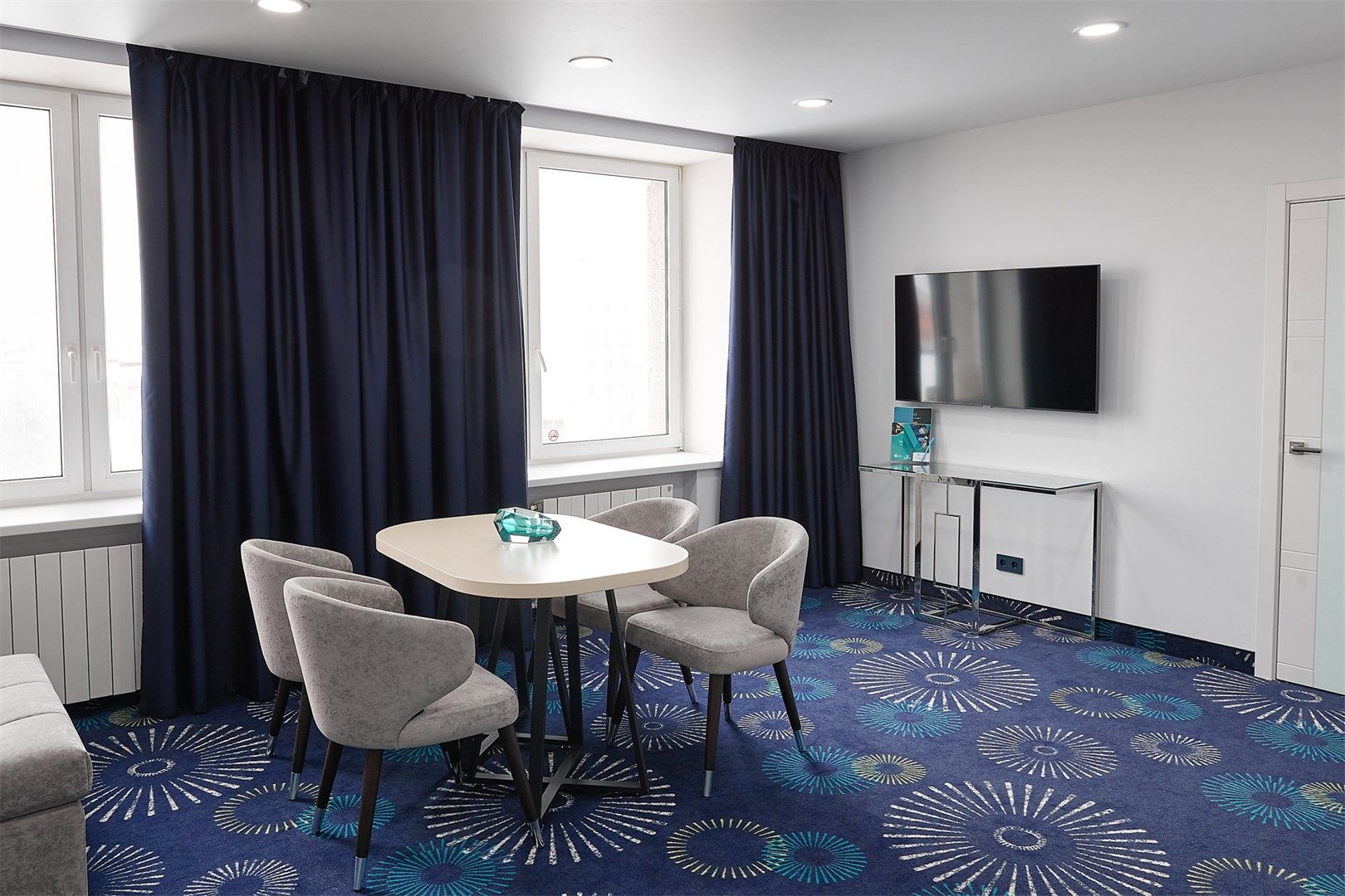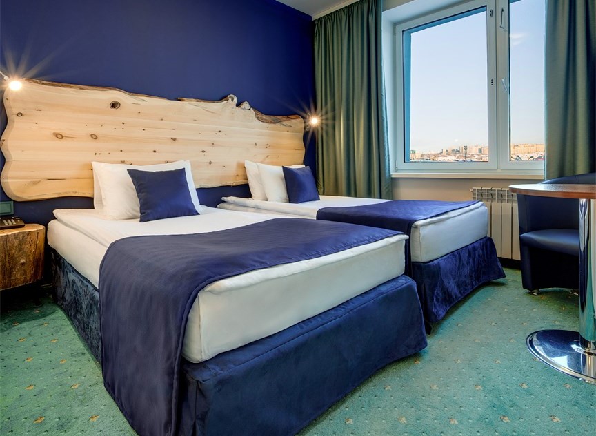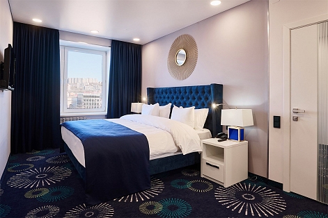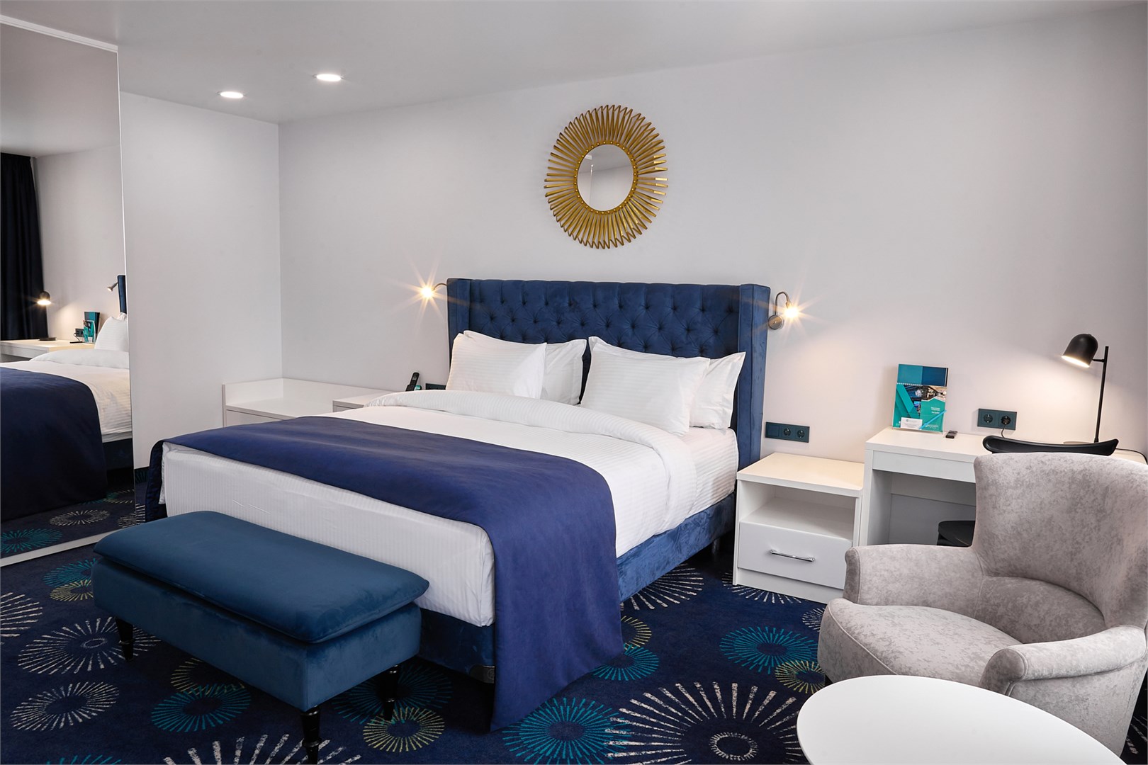 В комнатах интересный современный интерьер, выдержанный в приятных темно-синих оттенках с использованием ярких акцентных тонов. Везде есть просторный санузел с душем, электрочайник, мини-холодильник, плазменный телевизор.В отеле работают бар и ресторан с европейской кухней, для проведения торжественных мероприятий предусмотрен банкетный зал. Всем отдыхающим доступны услуги прачечной и беспроводной интернет, а для автовладельцев предусмотрена охраняемая парковка возле корпуса. Деловые встречи, семинары, конференции, переговоры можно провести в одном из современных конференц-залов. Самый большой из них — зал Океан Холл рассчитан на 300 приглашенных.