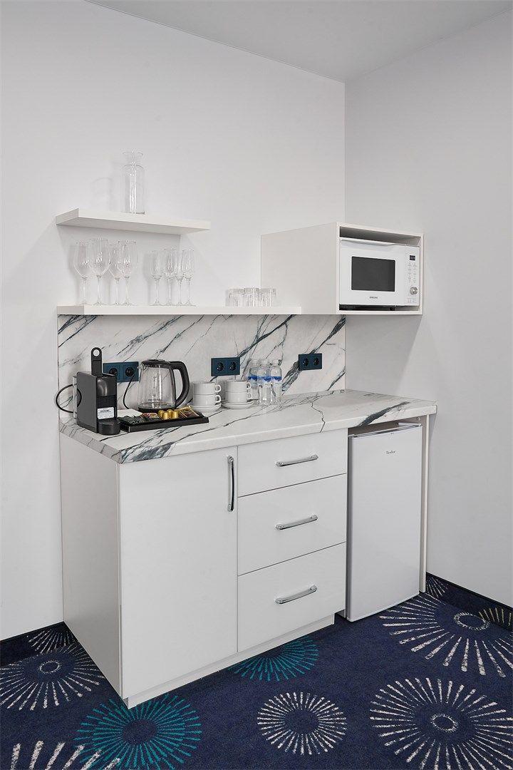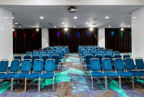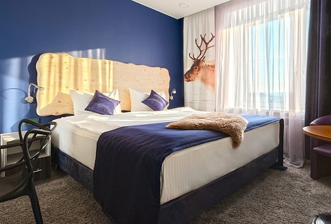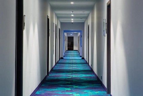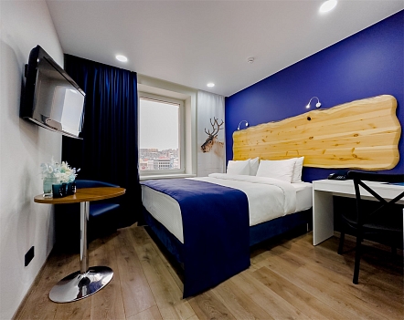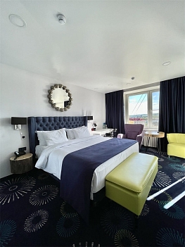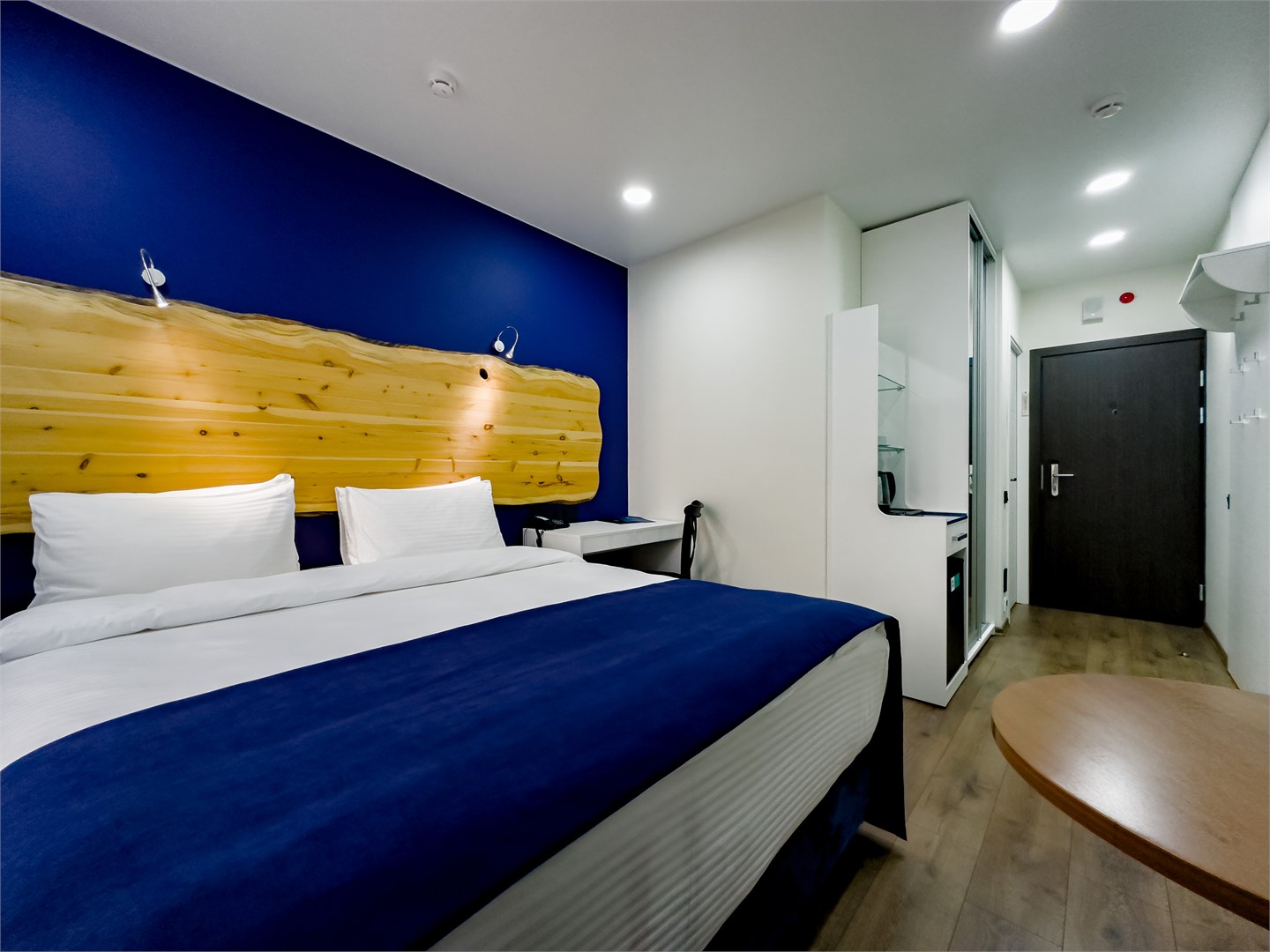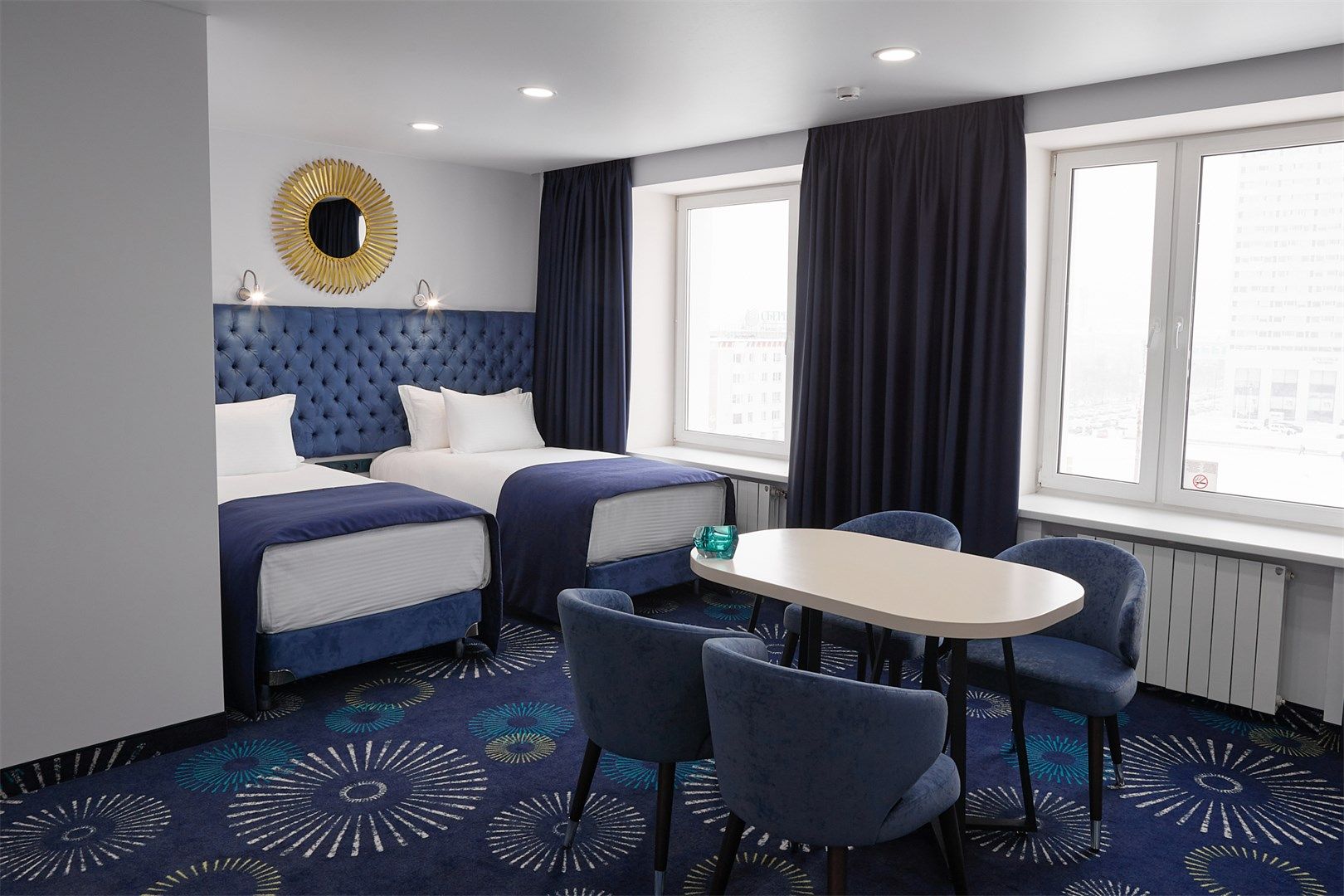В комнатах интересный современный интерьер, выдержанный в приятных темно-синих оттенках с использованием ярких акцентных тонов. Везде есть просторный санузел с душем, электрочайник, мини-холодильник, плазменный телевизор.В отеле работают бар и ресторан с европейской кухней, для проведения торжественных мероприятий предусмотрен банкетный зал. Всем отдыхающим доступны услуги прачечной и беспроводной интернет, а для автовладельцев предусмотрена охраняемая парковка возле корпуса. Деловые встречи, семинары, конференции, переговоры можно провести в одном из современных конференц-залов. Самый большой из них — зал Океан Холл рассчитан на 300 приглашенных.