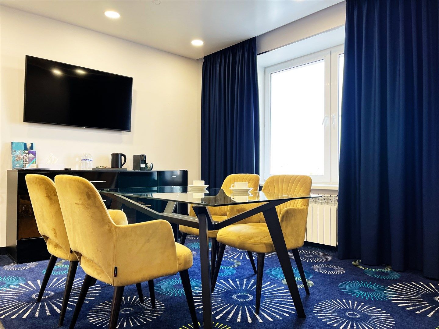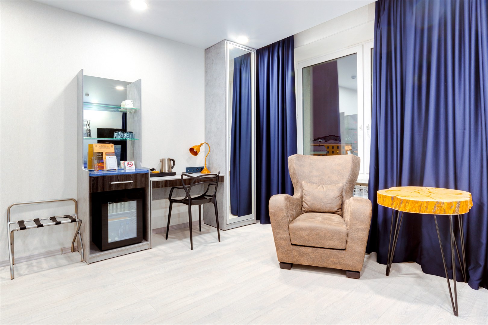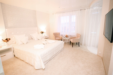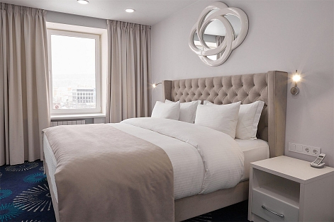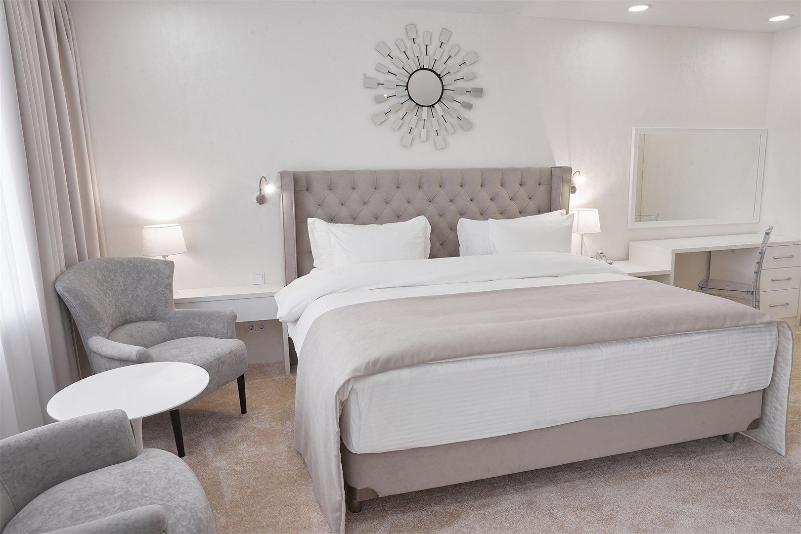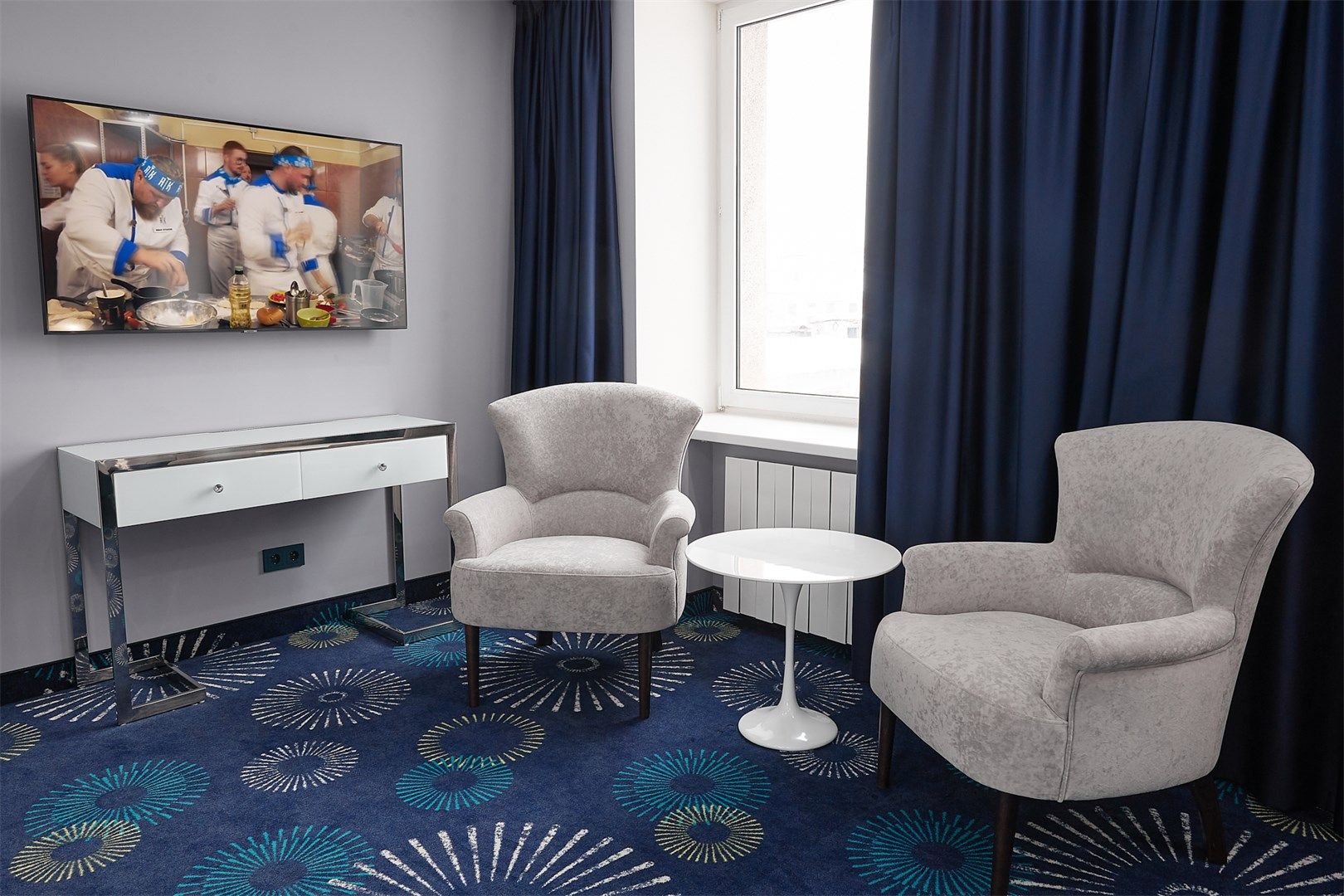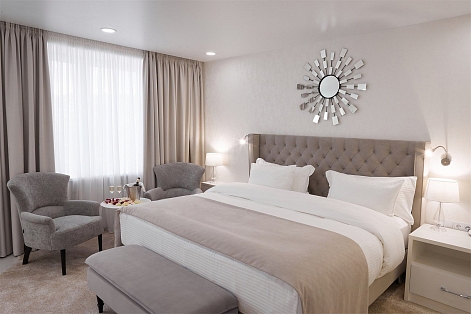 В номере: вешалка, диван, зеркало, кресла, кровать двуспальная, прикроватные тумбочки, стол, стулья, шкаф, мини-холодильник, сейф, телевизор, телефон, чайная станция